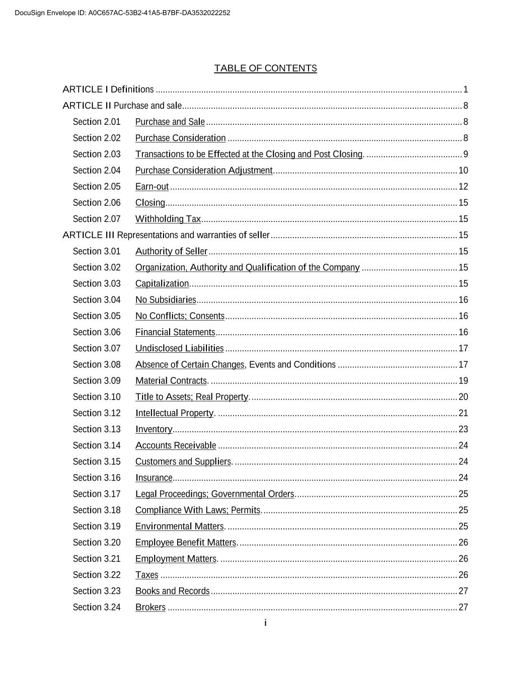i TABLE OF CONTENTS ARTICLE I Definitions ................................................................................................................................ 1 ARTICLE II Purchase and sale ..................................................................................................................... 8 Section 2.01 Purchase and Sale ........................................................................................................... 8 Section 2.02 Purchase Consideration .................................................................................................. 8 Section 2.03 Transactions to be Effected at the Closing and Post Closing. ........................................ 9 Section 2.04 Purchase Consideration Adjustment. ............................................................................ 10 Section 2.05 Earn-out ........................................................................................................................ 12 Section 2.06 Closing .......................................................................................................................... 15 Section 2.07 Withholding Tax ........................................................................................................... 15 ARTICLE III Representations and warranties of seller .............................................................................. 15 Section 3.01 Authority of Seller ........................................................................................................ 15 Section 3.02 Organization, Authority and Qualification of the Company ........................................ 15 Section 3.03 Capitalization. ............................................................................................................... 15 Section 3.04 No Subsidiaries ............................................................................................................. 16 Section 3.05 No Conflicts; Consents ................................................................................................. 16 Section 3.06 Financial Statements ..................................................................................................... 16 Section 3.07 Undisclosed Liabilities ................................................................................................. 17 Section 3.08 Absence of Certain Changes, Events and Conditions .................................................. 17 Section 3.09 Material Contracts. ....................................................................................................... 19 Section 3.10 Title to Assets; Real Property. ...................................................................................... 20 Section 3.12 Intellectual Property. .................................................................................................... 21 Section 3.13 Inventory....................................................................................................................... 23 Section 3.14 Accounts Receivable .................................................................................................... 24 Section 3.15 Customers and Suppliers. ............................................................................................. 24 Section 3.16 Insurance....................................................................................................................... 24 Section 3.17 Legal Proceedings; Governmental Orders. ................................................................... 25 Section 3.18 Compliance With Laws; Permits. ................................................................................. 25 Section 3.19 Environmental Matters. ................................................................................................ 25 Section 3.20 Employee Benefit Matters. ........................................................................................... 26 Section 3.21 Employment Matters. ................................................................................................... 26 Section 3.22 Taxes ............................................................................................................................ 26 Section 3.23 Books and Records ....................................................................................................... 27 Section 3.24 Brokers ......................................................................................................................... 27 DocuSign Envelope ID: A0C657AC-53B2-41A5-B7BF-DA3532022252