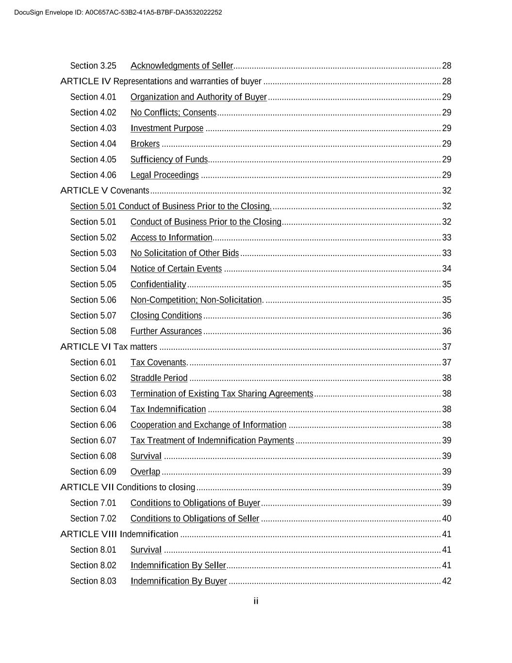 ii Section 3.25 Acknowledgments of Seller.......................................................................................... 28 ARTICLE IV Representations and warranties of buyer ............................................................................. 28 Section 4.01 Organization and Authority of Buyer ........................................................................... 29 Section 4.02 No Conflicts; Consents ................................................................................................. 29 Section 4.03 Investment Purpose ...................................................................................................... 29 Section 4.04 Brokers ......................................................................................................................... 29 Section 4.05 Sufficiency of Funds ..................................................................................................... 29 Section 4.06 Legal Proceedings ........................................................................................................ 29 ARTICLE V Covenants .............................................................................................................................. 32 Section 5.01 Conduct of Business Prior to the Closing. ......................................................................... 32 Section 5.01 Conduct of Business Prior to the Closing ..................................................................... 32 Section 5.02 Access to Information ................................................................................................... 33 Section 5.03 No Solicitation of Other Bids ....................................................................................... 33 Section 5.04 Notice of Certain Events .............................................................................................. 34 Section 5.05 Confidentiality .............................................................................................................. 35 Section 5.06 Non-Competition; Non-Solicitation. ............................................................................ 35 Section 5.07 Closing Conditions ....................................................................................................... 36 Section 5.08 Further Assurances ....................................................................................................... 36 ARTICLE VI Tax matters .......................................................................................................................... 37 Section 6.01 Tax Covenants. ............................................................................................................. 37 Section 6.02 Straddle Period ............................................................................................................. 38 Section 6.03 Termination of Existing Tax Sharing Agreements ....................................................... 38 Section 6.04 Tax Indemnification ..................................................................................................... 38 Section 6.06 Cooperation and Exchange of Information .................................................................. 38 Section 6.07 Tax Treatment of Indemnification Payments ............................................................... 39 Section 6.08 Survival ........................................................................................................................ 39 Section 6.09 Overlap ......................................................................................................................... 39 ARTICLE VII Conditions to closing .......................................................................................................... 39 Section 7.01 Conditions to Obligations of Buyer .............................................................................. 39 Section 7.02 Conditions to Obligations of Seller .............................................................................. 40 ARTICLE VIII Indemnification ................................................................................................................. 41 Section 8.01 Survival ........................................................................................................................ 41 Section 8.02 Indemnification By Seller ............................................................................................. 41 Section 8.03 Indemnification By Buyer ............................................................................................ 42 DocuSign Envelope ID: A0C657AC-53B2-41A5-B7BF-DA3532022252