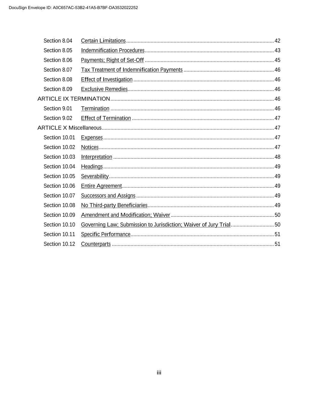 iii Section 8.04 Certain Limitations ....................................................................................................... 42 Section 8.05 Indemnification Procedures .......................................................................................... 43 Section 8.06 Payments; Right of Set-Off .......................................................................................... 45 Section 8.07 Tax Treatment of Indemnification Payments ............................................................... 46 Section 8.08 Effect of Investigation .................................................................................................. 46 Section 8.09 Exclusive Remedies ...................................................................................................... 46 ARTICLE IX TERMINATION .................................................................................................................. 46 Section 9.01 Termination .................................................................................................................. 46 Section 9.02 Effect of Termination ................................................................................................... 47 ARTICLE X Miscellaneous ........................................................................................................................ 47 Section 10.01 Expenses ....................................................................................................................... 47 Section 10.02 Notices .......................................................................................................................... 47 Section 10.03 Interpretation ................................................................................................................ 48 Section 10.04 Headings ....................................................................................................................... 49 Section 10.05 Severability ................................................................................................................... 49 Section 10.06 Entire Agreement .......................................................................................................... 49 Section 10.07 Successors and Assigns ................................................................................................ 49 Section 10.08 No Third-party Beneficiaries ........................................................................................ 49 Section 10.09 Amendment and Modification; Waiver ........................................................................ 50 Section 10.10 Governing Law; Submission to Jurisdiction; Waiver of Jury Trial. ............................. 50 Section 10.11 Specific Performance .................................................................................................... 51 Section 10.12 Counterparts ................................................................................................................. 51 DocuSign Envelope ID: A0C657AC-53B2-41A5-B7BF-DA3532022252