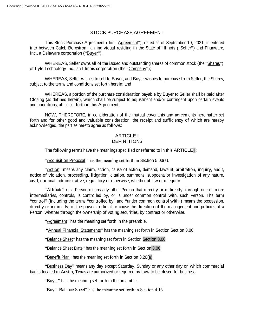 STOCK PURCHASE AGREEMENT This Stock Purchase Agreement (this “Agreement”), dated as of September 10, 2021, is entered into between Caleb Borgstrom, an individual residing in the State of Illinois (“Seller”) and Phunware, Inc., a Delaware corporation (“Buyer”). WHEREAS, Seller owns all of the issued and outstanding shares of common stock (the “Shares”) of Lyte Technology Inc., an Illinois corporation (the “Company”); WHEREAS, Seller wishes to sell to Buyer, and Buyer wishes to purchase from Seller, the Shares, subject to the terms and conditions set forth herein; and WHEREAS, a portion of the purchase consideration payable by Buyer to Seller shall be paid after Closing (as defined herein), which shall be subject to adjustment and/or contingent upon certain events and conditions, all as set forth in this Agreement; NOW, THEREFORE, in consideration of the mutual covenants and agreements hereinafter set forth and for other good and valuable consideration, the receipt and sufficiency of which are hereby acknowledged, the parties hereto agree as follows: ARTICLE I DEFINITIONS The following terms have the meanings specified or referred to in this ARTICLE I: “Acquisition Proposal” has the meaning set forth in Section 5.03(a). “Action” means any claim, action, cause of action, demand, lawsuit, arbitration, inquiry, audit, notice of violation, proceeding, litigation, citation, summons, subpoena or investigation of any nature, civil, criminal, administrative, regulatory or otherwise, whether at law or in equity. “Affiliate” of a Person means any other Person that directly or indirectly, through one or more intermediaries, controls, is controlled by, or is under common control with, such Person. The term “control” (including the terms “controlled by” and “under common control with”) means the possession, directly or indirectly, of the power to direct or cause the direction of the management and policies of a Person, whether through the ownership of voting securities, by contract or otherwise. “Agreement” has the meaning set forth in the preamble. “Annual Financial Statements” has the meaning set forth in Section Section 3.06. “Balance Sheet” has the meaning set forth in Section Section 3.06. “Balance Sheet Date” has the meaning set forth in Section 3.06. “Benefit Plan” has the meaning set forth in Section 3.20(a). “Business Day” means any day except Saturday, Sunday or any other day on which commercial banks located in Austin, Texas are authorized or required by Law to be closed for business. “Buyer” has the meaning set forth in the preamble. “Buyer Balance Sheet” has the meaning set forth in Section 4.13. DocuSign Envelope ID: A0C657AC-53B2-41A5-B7BF-DA3532022252