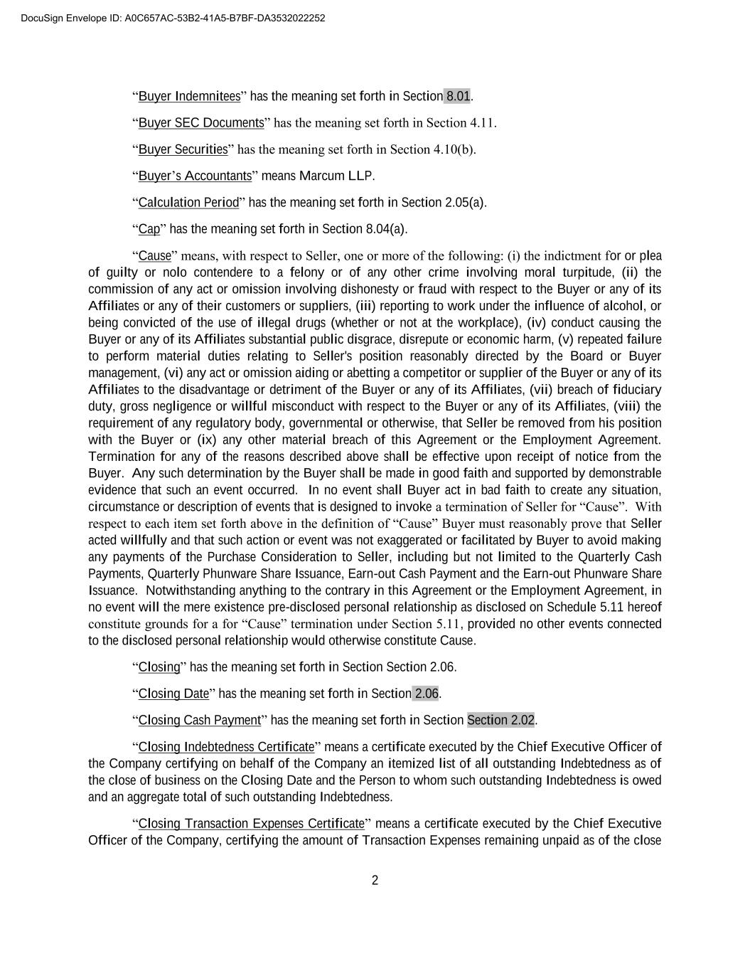 2 “Buyer Indemnitees” has the meaning set forth in Section 8.01. “Buyer SEC Documents” has the meaning set forth in Section 4.11. “Buyer Securities” has the meaning set forth in Section 4.10(b). “Buyer’s Accountants” means Marcum LLP. “Calculation Period” has the meaning set forth in Section 2.05(a). “Cap” has the meaning set forth in Section 8.04(a). “Cause” means, with respect to Seller, one or more of the following: (i) the indictment for or plea of guilty or nolo contendere to a felony or of any other crime involving moral turpitude, (ii) the commission of any act or omission involving dishonesty or fraud with respect to the Buyer or any of its Affiliates or any of their customers or suppliers, (iii) reporting to work under the influence of alcohol, or being convicted of the use of illegal drugs (whether or not at the workplace), (iv) conduct causing the Buyer or any of its Affiliates substantial public disgrace, disrepute or economic harm, (v) repeated failure to perform material duties relating to Seller's position reasonably directed by the Board or Buyer management, (vi) any act or omission aiding or abetting a competitor or supplier of the Buyer or any of its Affiliates to the disadvantage or detriment of the Buyer or any of its Affiliates, (vii) breach of fiduciary duty, gross negligence or willful misconduct with respect to the Buyer or any of its Affiliates, (viii) the requirement of any regulatory body, governmental or otherwise, that Seller be removed from his position with the Buyer or (ix) any other material breach of this Agreement or the Employment Agreement. Termination for any of the reasons described above shall be effective upon receipt of notice from the Buyer. Any such determination by the Buyer shall be made in good faith and supported by demonstrable evidence that such an event occurred. In no event shall Buyer act in bad faith to create any situation, circumstance or description of events that is designed to invoke a termination of Seller for “Cause”. With respect to each item set forth above in the definition of “Cause” Buyer must reasonably prove that Seller acted willfully and that such action or event was not exaggerated or facilitated by Buyer to avoid making any payments of the Purchase Consideration to Seller, including but not limited to the Quarterly Cash Payments, Quarterly Phunware Share Issuance, Earn-out Cash Payment and the Earn-out Phunware Share Issuance. Notwithstanding anything to the contrary in this Agreement or the Employment Agreement, in no event will the mere existence pre-disclosed personal relationship as disclosed on Schedule 5.11 hereof constitute grounds for a for “Cause” termination under Section 5.11, provided no other events connected to the disclosed personal relationship would otherwise constitute Cause. “Closing” has the meaning set forth in Section Section 2.06. “Closing Date” has the meaning set forth in Section 2.06. “Closing Cash Payment” has the meaning set forth in Section Section 2.02. “Closing Indebtedness Certificate” means a certificate executed by the Chief Executive Officer of the Company certifying on behalf of the Company an itemized list of all outstanding Indebtedness as of the close of business on the Closing Date and the Person to whom such outstanding Indebtedness is owed and an aggregate total of such outstanding Indebtedness. “Closing Transaction Expenses Certificate” means a certificate executed by the Chief Executive Officer of the Company, certifying the amount of Transaction Expenses remaining unpaid as of the close DocuSign Envelope ID: A0C657AC-53B2-41A5-B7BF-DA3532022252