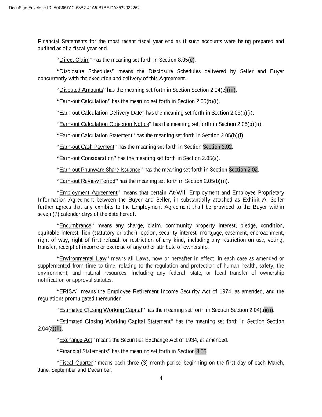 4 Financial Statements for the most recent fiscal year end as if such accounts were being prepared and audited as of a fiscal year end. “Direct Claim” has the meaning set forth in Section 8.05(c). “Disclosure Schedules” means the Disclosure Schedules delivered by Seller and Buyer concurrently with the execution and delivery of this Agreement. “Disputed Amounts” has the meaning set forth in Section Section 2.04(c)(iii). “Earn-out Calculation” has the meaning set forth in Section 2.05(b)(i). “Earn-out Calculation Delivery Date” has the meaning set forth in Section 2.05(b)(i). “Earn-out Calculation Objection Notice” has the meaning set forth in Section 2.05(b)(ii). “Earn-out Calculation Statement” has the meaning set forth in Section 2.05(b)(i). “Earn-out Cash Payment” has the meaning set forth in Section Section 2.02. “Earn-out Consideration” has the meaning set forth in Section 2.05(a). “Earn-out Phunware Share Issuance” has the meaning set forth in Section Section 2.02. “Earn-out Review Period” has the meaning set forth in Section 2.05(b)(ii). “Employment Agreement” means that certain At-Will Employment and Employee Proprietary Information Agreement between the Buyer and Seller, in substantially attached as Exhibit A. Seller further agrees that any exhibits to the Employment Agreement shall be provided to the Buyer within seven (7) calendar days of the date hereof. “Encumbrance” means any charge, claim, community property interest, pledge, condition, equitable interest, lien (statutory or other), option, security interest, mortgage, easement, encroachment, right of way, right of first refusal, or restriction of any kind, including any restriction on use, voting, transfer, receipt of income or exercise of any other attribute of ownership. “Environmental Law” means all Laws, now or hereafter in effect, in each case as amended or supplemented from time to time, relating to the regulation and protection of human health, safety, the environment, and natural resources, including any federal, state, or local transfer of ownership notification or approval statutes. “ERISA” means the Employee Retirement Income Security Act of 1974, as amended, and the regulations promulgated thereunder. “Estimated Closing Working Capital” has the meaning set forth in Section Section 2.04(a)(ii). “Estimated Closing Working Capital Statement” has the meaning set forth in Section Section 2.04(a)(ii). “Exchange Act” means the Securities Exchange Act of 1934, as amended. “Financial Statements” has the meaning set forth in Section 3.06. “Fiscal Quarter” means each three (3) month period beginning on the first day of each March, June, September and December. DocuSign Envelope ID: A0C657AC-53B2-41A5-B7BF-DA3532022252