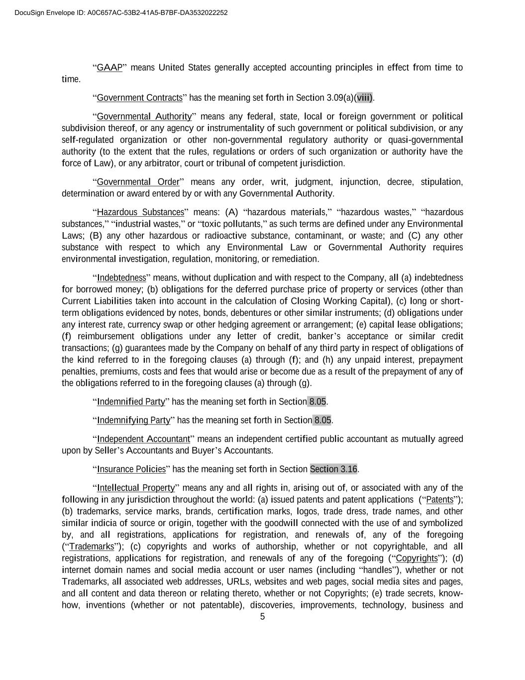 5 “GAAP” means United States generally accepted accounting principles in effect from time to time. “Government Contracts” has the meaning set forth in Section 3.09(a)(viii). “Governmental Authority” means any federal, state, local or foreign government or political subdivision thereof, or any agency or instrumentality of such government or political subdivision, or any self-regulated organization or other non-governmental regulatory authority or quasi-governmental authority (to the extent that the rules, regulations or orders of such organization or authority have the force of Law), or any arbitrator, court or tribunal of competent jurisdiction. “Governmental Order” means any order, writ, judgment, injunction, decree, stipulation, determination or award entered by or with any Governmental Authority. “Hazardous Substances” means: (A) “hazardous materials,” “hazardous wastes,” “hazardous substances,” “industrial wastes,” or “toxic pollutants,” as such terms are defined under any Environmental Laws; (B) any other hazardous or radioactive substance, contaminant, or waste; and (C) any other substance with respect to which any Environmental Law or Governmental Authority requires environmental investigation, regulation, monitoring, or remediation. “Indebtedness” means, without duplication and with respect to the Company, all (a) indebtedness for borrowed money; (b) obligations for the deferred purchase price of property or services (other than Current Liabilities taken into account in the calculation of Closing Working Capital), (c) long or short- term obligations evidenced by notes, bonds, debentures or other similar instruments; (d) obligations under any interest rate, currency swap or other hedging agreement or arrangement; (e) capital lease obligations; (f) reimbursement obligations under any letter of credit, banker’s acceptance or similar credit transactions; (g) guarantees made by the Company on behalf of any third party in respect of obligations of the kind referred to in the foregoing clauses (a) through (f); and (h) any unpaid interest, prepayment penalties, premiums, costs and fees that would arise or become due as a result of the prepayment of any of the obligations referred to in the foregoing clauses (a) through (g). “Indemnified Party” has the meaning set forth in Section 8.05. “Indemnifying Party” has the meaning set forth in Section 8.05. “Independent Accountant” means an independent certified public accountant as mutually agreed upon by Seller’s Accountants and Buyer’s Accountants. “Insurance Policies” has the meaning set forth in Section Section 3.16. “Intellectual Property” means any and all rights in, arising out of, or associated with any of the following in any jurisdiction throughout the world: (a) issued patents and patent applications (“Patents”); (b) trademarks, service marks, brands, certification marks, logos, trade dress, trade names, and other similar indicia of source or origin, together with the goodwill connected with the use of and symbolized by, and all registrations, applications for registration, and renewals of, any of the foregoing (“Trademarks”); (c) copyrights and works of authorship, whether or not copyrightable, and all registrations, applications for registration, and renewals of any of the foregoing (“Copyrights”); (d) internet domain names and social media account or user names (including “handles”), whether or not Trademarks, all associated web addresses, URLs, websites and web pages, social media sites and pages, and all content and data thereon or relating thereto, whether or not Copyrights; (e) trade secrets, know- how, inventions (whether or not patentable), discoveries, improvements, technology, business and DocuSign Envelope ID: A0C657AC-53B2-41A5-B7BF-DA3532022252