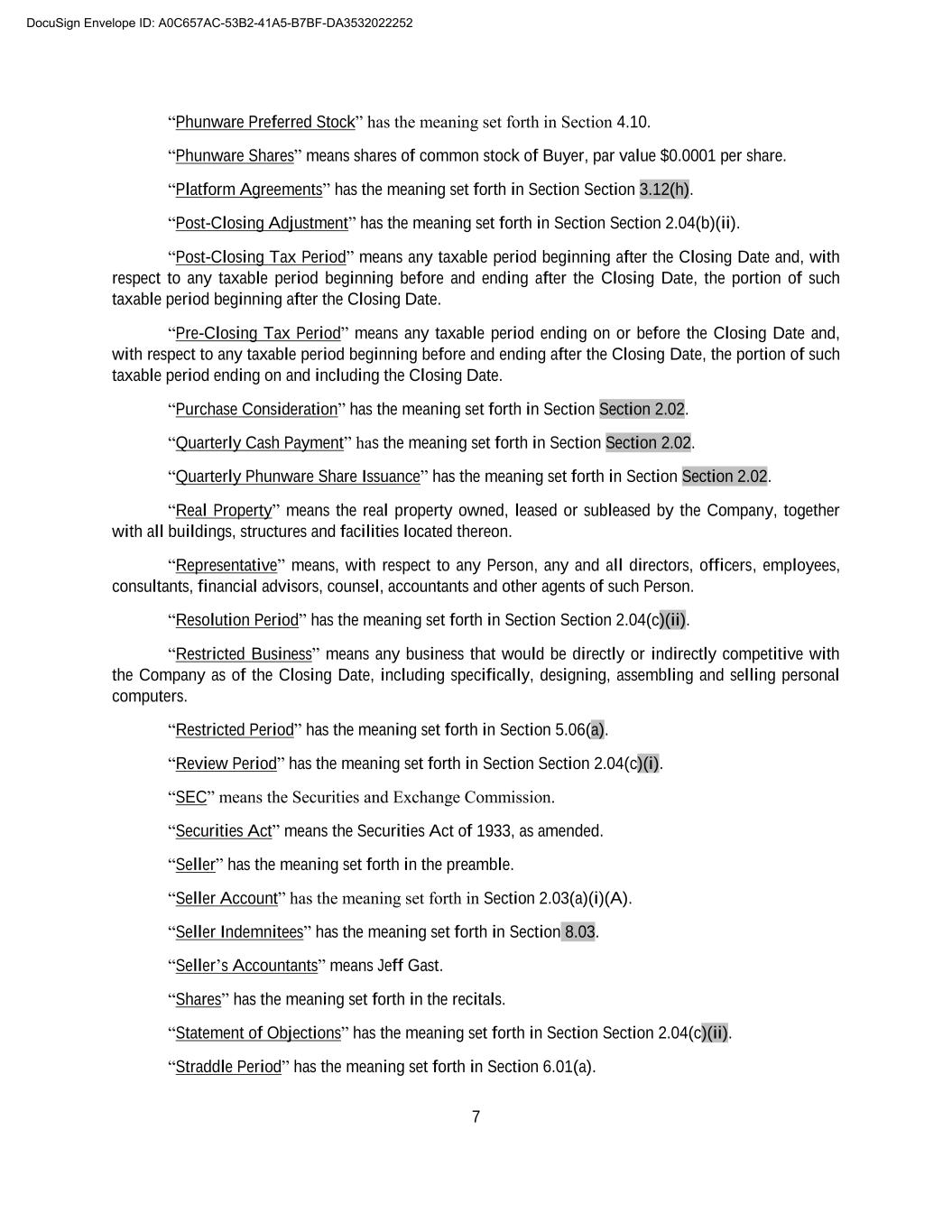 7 “Phunware Preferred Stock” has the meaning set forth in Section 4.10. “Phunware Shares” means shares of common stock of Buyer, par value $0.0001 per share. “Platform Agreements” has the meaning set forth in Section Section 3.12(h). “Post-Closing Adjustment” has the meaning set forth in Section Section 2.04(b)(ii). “Post-Closing Tax Period” means any taxable period beginning after the Closing Date and, with respect to any taxable period beginning before and ending after the Closing Date, the portion of such taxable period beginning after the Closing Date. “Pre-Closing Tax Period” means any taxable period ending on or before the Closing Date and, with respect to any taxable period beginning before and ending after the Closing Date, the portion of such taxable period ending on and including the Closing Date. “Purchase Consideration” has the meaning set forth in Section Section 2.02. “Quarterly Cash Payment” has the meaning set forth in Section Section 2.02. “Quarterly Phunware Share Issuance” has the meaning set forth in Section Section 2.02. “Real Property” means the real property owned, leased or subleased by the Company, together with all buildings, structures and facilities located thereon. “Representative” means, with respect to any Person, any and all directors, officers, employees, consultants, financial advisors, counsel, accountants and other agents of such Person. “Resolution Period” has the meaning set forth in Section Section 2.04(c)(ii). “Restricted Business” means any business that would be directly or indirectly competitive with the Company as of the Closing Date, including specifically, designing, assembling and selling personal computers. “Restricted Period” has the meaning set forth in Section 5.06(a). “Review Period” has the meaning set forth in Section Section 2.04(c)(i). “SEC” means the Securities and Exchange Commission. “Securities Act” means the Securities Act of 1933, as amended. “Seller” has the meaning set forth in the preamble. “Seller Account” has the meaning set forth in Section 2.03(a)(i)(A). “Seller Indemnitees” has the meaning set forth in Section 8.03. “Seller’s Accountants” means Jeff Gast. “Shares” has the meaning set forth in the recitals. “Statement of Objections” has the meaning set forth in Section Section 2.04(c)(ii). “Straddle Period” has the meaning set forth in Section 6.01(a). DocuSign Envelope ID: A0C657AC-53B2-41A5-B7BF-DA3532022252