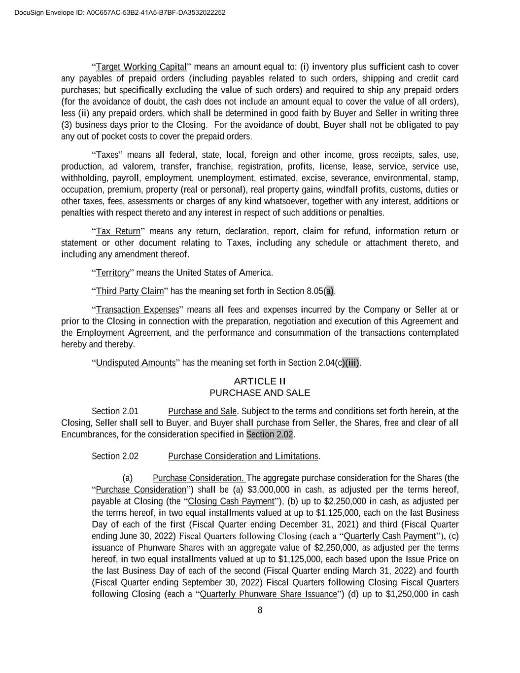 8 “Target Working Capital” means an amount equal to: (i) inventory plus sufficient cash to cover any payables of prepaid orders (including payables related to such orders, shipping and credit card purchases; but specifically excluding the value of such orders) and required to ship any prepaid orders (for the avoidance of doubt, the cash does not include an amount equal to cover the value of all orders), less (ii) any prepaid orders, which shall be determined in good faith by Buyer and Seller in writing three (3) business days prior to the Closing. For the avoidance of doubt, Buyer shall not be obligated to pay any out of pocket costs to cover the prepaid orders. “Taxes” means all federal, state, local, foreign and other income, gross receipts, sales, use, production, ad valorem, transfer, franchise, registration, profits, license, lease, service, service use, withholding, payroll, employment, unemployment, estimated, excise, severance, environmental, stamp, occupation, premium, property (real or personal), real property gains, windfall profits, customs, duties or other taxes, fees, assessments or charges of any kind whatsoever, together with any interest, additions or penalties with respect thereto and any interest in respect of such additions or penalties. “Tax Return” means any return, declaration, report, claim for refund, information return or statement or other document relating to Taxes, including any schedule or attachment thereto, and including any amendment thereof. “Territory” means the United States of America. “Third Party Claim” has the meaning set forth in Section 8.05(a). “Transaction Expenses” means all fees and expenses incurred by the Company or Seller at or prior to the Closing in connection with the preparation, negotiation and execution of this Agreement and the Employment Agreement, and the performance and consummation of the transactions contemplated hereby and thereby. “Undisputed Amounts” has the meaning set forth in Section 2.04(c)(iii). ARTICLE II PURCHASE AND SALE Section 2.01 Purchase and Sale. Subject to the terms and conditions set forth herein, at the Closing, Seller shall sell to Buyer, and Buyer shall purchase from Seller, the Shares, free and clear of all Encumbrances, for the consideration specified in Section 2.02. Section 2.02 Purchase Consideration and Limitations. (a) Purchase Consideration. The aggregate purchase consideration for the Shares (the “Purchase Consideration”) shall be (a) $3,000,000 in cash, as adjusted per the terms hereof, payable at Closing (the “Closing Cash Payment”), (b) up to $2,250,000 in cash, as adjusted per the terms hereof, in two equal installments valued at up to $1,125,000, each on the last Business Day of each of the first (Fiscal Quarter ending December 31, 2021) and third (Fiscal Quarter ending June 30, 2022) Fiscal Quarters following Closing (each a “Quarterly Cash Payment”), (c) issuance of Phunware Shares with an aggregate value of $2,250,000, as adjusted per the terms hereof, in two equal installments valued at up to $1,125,000, each based upon the Issue Price on the last Business Day of each of the second (Fiscal Quarter ending March 31, 2022) and fourth (Fiscal Quarter ending September 30, 2022) Fiscal Quarters following Closing Fiscal Quarters following Closing (each a “Quarterly Phunware Share Issuance”) (d) up to $1,250,000 in cash DocuSign Envelope ID: A0C657AC-53B2-41A5-B7BF-DA3532022252