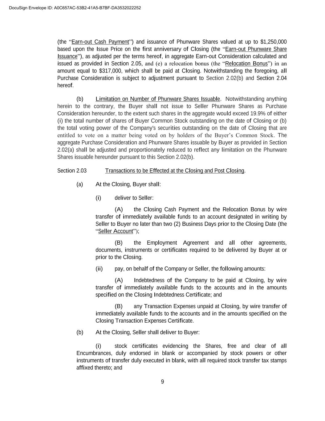 9 (the “Earn-out Cash Payment”) and issuance of Phunware Shares valued at up to $1,250,000 based upon the Issue Price on the first anniversary of Closing (the “Earn-out Phunware Share Issuance”), as adjusted per the terms hereof, in aggregate Earn-out Consideration calculated and issued as provided in Section 2.05, and (e) a relocation bonus (the “Relocation Bonus”) in an amount equal to $317,000, which shall be paid at Closing. Notwithstanding the foregoing, all Purchase Consideration is subject to adjustment pursuant to Section 2.02(b) and Section 2.04 hereof. (b) Limitation on Number of Phunware Shares Issuable. Notwithstanding anything herein to the contrary, the Buyer shall not issue to Seller Phunware Shares as Purchase Consideration hereunder, to the extent such shares in the aggregate would exceed 19.9% of either (i) the total number of shares of Buyer Common Stock outstanding on the date of Closing or (b) the total voting power of the Company's securities outstanding on the date of Closing that are entitled to vote on a matter being voted on by holders of the Buyer’s Common Stock. The aggregate Purchase Consideration and Phunware Shares issuable by Buyer as provided in Section 2.02(a) shall be adjusted and proportionately reduced to reflect any limitation on the Phunware Shares issuable hereunder pursuant to this Section 2.02(b). Section 2.03 Transactions to be Effected at the Closing and Post Closing. (a) At the Closing, Buyer shall: (i) deliver to Seller: (A) the Closing Cash Payment and the Relocation Bonus by wire transfer of immediately available funds to an account designated in writing by Seller to Buyer no later than two (2) Business Days prior to the Closing Date (the “Seller Account”); (B) the Employment Agreement and all other agreements, documents, instruments or certificates required to be delivered by Buyer at or prior to the Closing. (ii) pay, on behalf of the Company or Seller, the following amounts: (A) Indebtedness of the Company to be paid at Closing, by wire transfer of immediately available funds to the accounts and in the amounts specified on the Closing Indebtedness Certificate; and (B) any Transaction Expenses unpaid at Closing, by wire transfer of immediately available funds to the accounts and in the amounts specified on the Closing Transaction Expenses Certificate. (b) At the Closing, Seller shall deliver to Buyer: (i) stock certificates evidencing the Shares, free and clear of all Encumbrances, duly endorsed in blank or accompanied by stock powers or other instruments of transfer duly executed in blank, with all required stock transfer tax stamps affixed thereto; and DocuSign Envelope ID: A0C657AC-53B2-41A5-B7BF-DA3532022252