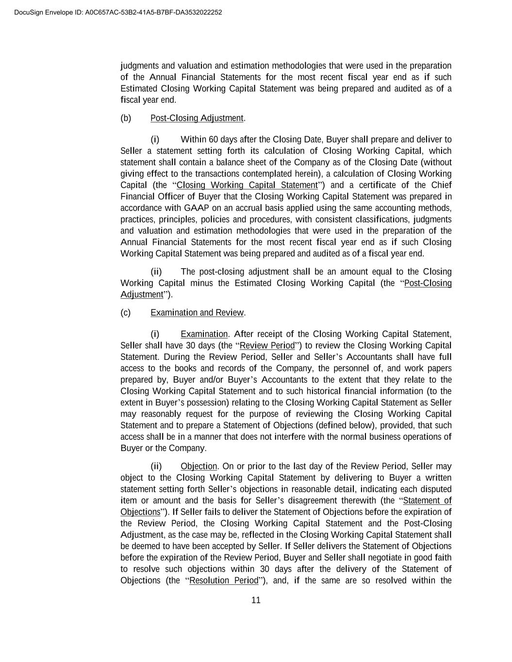 11 judgments and valuation and estimation methodologies that were used in the preparation of the Annual Financial Statements for the most recent fiscal year end as if such Estimated Closing Working Capital Statement was being prepared and audited as of a fiscal year end. (b) Post-Closing Adjustment. (i) Within 60 days after the Closing Date, Buyer shall prepare and deliver to Seller a statement setting forth its calculation of Closing Working Capital, which statement shall contain a balance sheet of the Company as of the Closing Date (without giving effect to the transactions contemplated herein), a calculation of Closing Working Capital (the “Closing Working Capital Statement”) and a certificate of the Chief Financial Officer of Buyer that the Closing Working Capital Statement was prepared in accordance with GAAP on an accrual basis applied using the same accounting methods, practices, principles, policies and procedures, with consistent classifications, judgments and valuation and estimation methodologies that were used in the preparation of the Annual Financial Statements for the most recent fiscal year end as if such Closing Working Capital Statement was being prepared and audited as of a fiscal year end. (ii) The post-closing adjustment shall be an amount equal to the Closing Working Capital minus the Estimated Closing Working Capital (the “Post-Closing Adjustment”). (c) Examination and Review. (i) Examination. After receipt of the Closing Working Capital Statement, Seller shall have 30 days (the “Review Period”) to review the Closing Working Capital Statement. During the Review Period, Seller and Seller’s Accountants shall have full access to the books and records of the Company, the personnel of, and work papers prepared by, Buyer and/or Buyer’s Accountants to the extent that they relate to the Closing Working Capital Statement and to such historical financial information (to the extent in Buyer’s possession) relating to the Closing Working Capital Statement as Seller may reasonably request for the purpose of reviewing the Closing Working Capital Statement and to prepare a Statement of Objections (defined below), provided, that such access shall be in a manner that does not interfere with the normal business operations of Buyer or the Company. (ii) Objection. On or prior to the last day of the Review Period, Seller may object to the Closing Working Capital Statement by delivering to Buyer a written statement setting forth Seller’s objections in reasonable detail, indicating each disputed item or amount and the basis for Seller’s disagreement therewith (the “Statement of Objections”). If Seller fails to deliver the Statement of Objections before the expiration of the Review Period, the Closing Working Capital Statement and the Post-Closing Adjustment, as the case may be, reflected in the Closing Working Capital Statement shall be deemed to have been accepted by Seller. If Seller delivers the Statement of Objections before the expiration of the Review Period, Buyer and Seller shall negotiate in good faith to resolve such objections within 30 days after the delivery of the Statement of Objections (the “Resolution Period”), and, if the same are so resolved within the DocuSign Envelope ID: A0C657AC-53B2-41A5-B7BF-DA3532022252