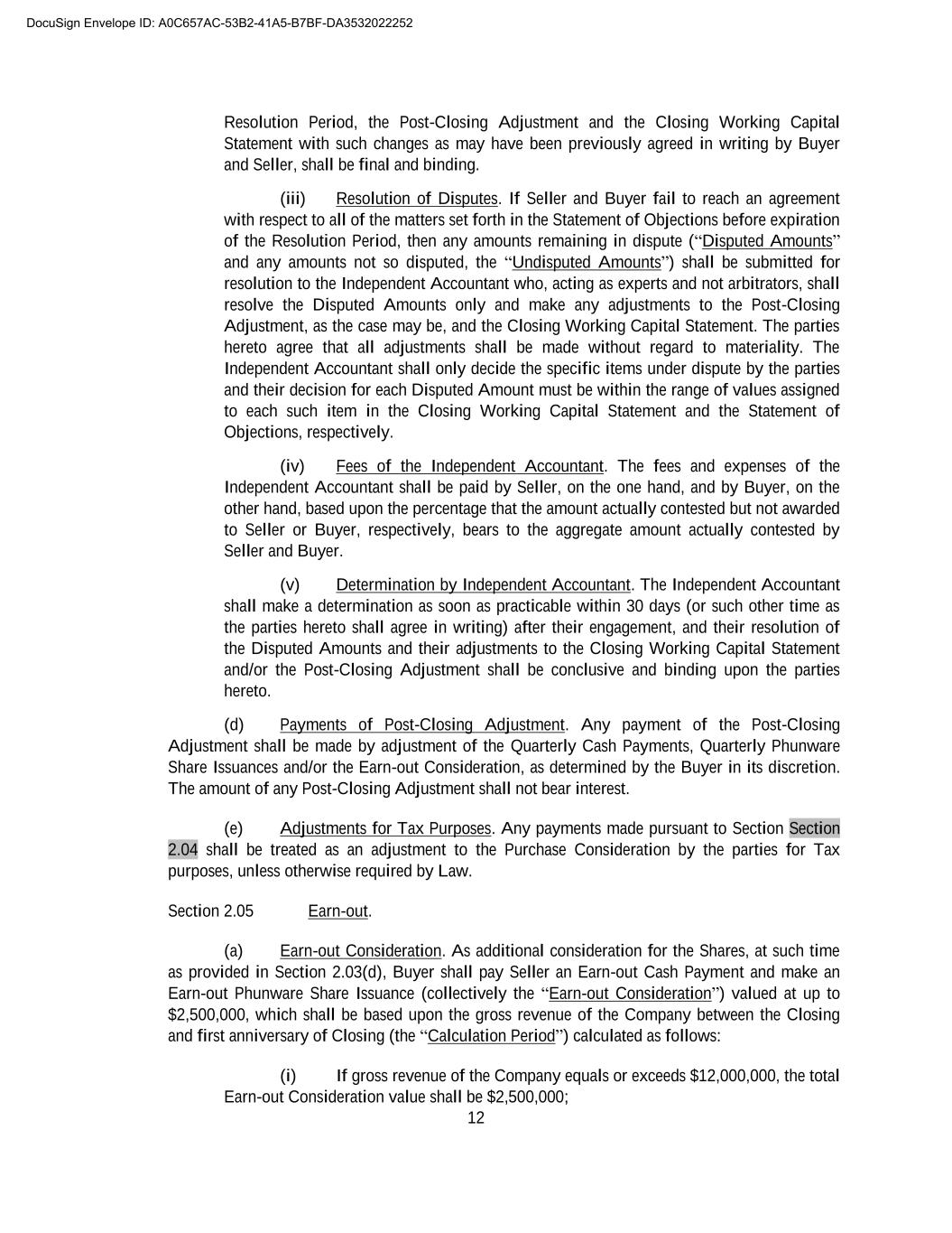 12 Resolution Period, the Post-Closing Adjustment and the Closing Working Capital Statement with such changes as may have been previously agreed in writing by Buyer and Seller, shall be final and binding. (iii) Resolution of Disputes. If Seller and Buyer fail to reach an agreement with respect to all of the matters set forth in the Statement of Objections before expiration of the Resolution Period, then any amounts remaining in dispute (“Disputed Amounts” and any amounts not so disputed, the “Undisputed Amounts”) shall be submitted for resolution to the Independent Accountant who, acting as experts and not arbitrators, shall resolve the Disputed Amounts only and make any adjustments to the Post-Closing Adjustment, as the case may be, and the Closing Working Capital Statement. The parties hereto agree that all adjustments shall be made without regard to materiality. The Independent Accountant shall only decide the specific items under dispute by the parties and their decision for each Disputed Amount must be within the range of values assigned to each such item in the Closing Working Capital Statement and the Statement of Objections, respectively. (iv) Fees of the Independent Accountant. The fees and expenses of the Independent Accountant shall be paid by Seller, on the one hand, and by Buyer, on the other hand, based upon the percentage that the amount actually contested but not awarded to Seller or Buyer, respectively, bears to the aggregate amount actually contested by Seller and Buyer. (v) Determination by Independent Accountant. The Independent Accountant shall make a determination as soon as practicable within 30 days (or such other time as the parties hereto shall agree in writing) after their engagement, and their resolution of the Disputed Amounts and their adjustments to the Closing Working Capital Statement and/or the Post-Closing Adjustment shall be conclusive and binding upon the parties hereto. (d) Payments of Post-Closing Adjustment. Any payment of the Post-Closing Adjustment shall be made by adjustment of the Quarterly Cash Payments, Quarterly Phunware Share Issuances and/or the Earn-out Consideration, as determined by the Buyer in its discretion. The amount of any Post-Closing Adjustment shall not bear interest. (e) Adjustments for Tax Purposes. Any payments made pursuant to Section Section 2.04 shall be treated as an adjustment to the Purchase Consideration by the parties for Tax purposes, unless otherwise required by Law. Section 2.05 Earn-out. (a) Earn-out Consideration. As additional consideration for the Shares, at such time as provided in Section 2.03(d), Buyer shall pay Seller an Earn-out Cash Payment and make an Earn-out Phunware Share Issuance (collectively the “Earn-out Consideration”) valued at up to $2,500,000, which shall be based upon the gross revenue of the Company between the Closing and first anniversary of Closing (the “Calculation Period”) calculated as follows: (i) If gross revenue of the Company equals or exceeds $12,000,000, the total Earn-out Consideration value shall be $2,500,000; DocuSign Envelope ID: A0C657AC-53B2-41A5-B7BF-DA3532022252