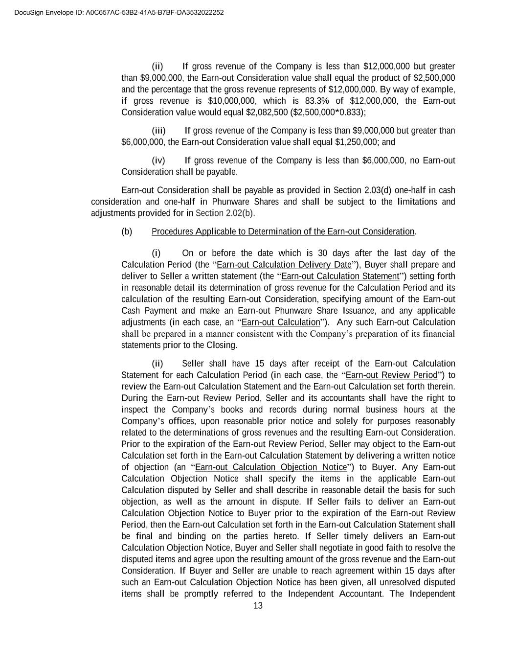 13 (ii) If gross revenue of the Company is less than $12,000,000 but greater than $9,000,000, the Earn-out Consideration value shall equal the product of $2,500,000 and the percentage that the gross revenue represents of $12,000,000. By way of example, if gross revenue is $10,000,000, which is 83.3% of $12,000,000, the Earn-out Consideration value would equal $2,082,500 ($2,500,000*0.833); (iii) If gross revenue of the Company is less than $9,000,000 but greater than $6,000,000, the Earn-out Consideration value shall equal $1,250,000; and (iv) If gross revenue of the Company is less than $6,000,000, no Earn-out Consideration shall be payable. Earn-out Consideration shall be payable as provided in Section 2.03(d) one-half in cash consideration and one-half in Phunware Shares and shall be subject to the limitations and adjustments provided for in Section 2.02(b). (b) Procedures Applicable to Determination of the Earn-out Consideration. (i) On or before the date which is 30 days after the last day of the Calculation Period (the “Earn-out Calculation Delivery Date”), Buyer shall prepare and deliver to Seller a written statement (the “Earn-out Calculation Statement”) setting forth in reasonable detail its determination of gross revenue for the Calculation Period and its calculation of the resulting Earn-out Consideration, specifying amount of the Earn-out Cash Payment and make an Earn-out Phunware Share Issuance, and any applicable adjustments (in each case, an “Earn-out Calculation”). Any such Earn-out Calculation shall be prepared in a manner consistent with the Company’s preparation of its financial statements prior to the Closing. (ii) Seller shall have 15 days after receipt of the Earn-out Calculation Statement for each Calculation Period (in each case, the “Earn-out Review Period”) to review the Earn-out Calculation Statement and the Earn-out Calculation set forth therein. During the Earn-out Review Period, Seller and its accountants shall have the right to inspect the Company’s books and records during normal business hours at the Company’s offices, upon reasonable prior notice and solely for purposes reasonably related to the determinations of gross revenues and the resulting Earn-out Consideration. Prior to the expiration of the Earn-out Review Period, Seller may object to the Earn-out Calculation set forth in the Earn-out Calculation Statement by delivering a written notice of objection (an “Earn-out Calculation Objection Notice”) to Buyer. Any Earn-out Calculation Objection Notice shall specify the items in the applicable Earn-out Calculation disputed by Seller and shall describe in reasonable detail the basis for such objection, as well as the amount in dispute. If Seller fails to deliver an Earn-out Calculation Objection Notice to Buyer prior to the expiration of the Earn-out Review Period, then the Earn-out Calculation set forth in the Earn-out Calculation Statement shall be final and binding on the parties hereto. If Seller timely delivers an Earn-out Calculation Objection Notice, Buyer and Seller shall negotiate in good faith to resolve the disputed items and agree upon the resulting amount of the gross revenue and the Earn-out Consideration. If Buyer and Seller are unable to reach agreement within 15 days after such an Earn-out Calculation Objection Notice has been given, all unresolved disputed items shall be promptly referred to the Independent Accountant. The Independent DocuSign Envelope ID: A0C657AC-53B2-41A5-B7BF-DA3532022252