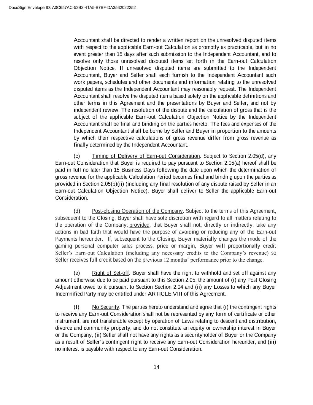 14 Accountant shall be directed to render a written report on the unresolved disputed items with respect to the applicable Earn-out Calculation as promptly as practicable, but in no event greater than 15 days after such submission to the Independent Accountant, and to resolve only those unresolved disputed items set forth in the Earn-out Calculation Objection Notice. If unresolved disputed items are submitted to the Independent Accountant, Buyer and Seller shall each furnish to the Independent Accountant such work papers, schedules and other documents and information relating to the unresolved disputed items as the Independent Accountant may reasonably request. The Independent Accountant shall resolve the disputed items based solely on the applicable definitions and other terms in this Agreement and the presentations by Buyer and Seller, and not by independent review. The resolution of the dispute and the calculation of gross that is the subject of the applicable Earn-out Calculation Objection Notice by the Independent Accountant shall be final and binding on the parties hereto. The fees and expenses of the Independent Accountant shall be borne by Seller and Buyer in proportion to the amounts by which their respective calculations of gross revenue differ from gross revenue as finally determined by the Independent Accountant. (c) Timing of Delivery of Earn-out Consideration. Subject to Section 2.05(d), any Earn-out Consideration that Buyer is required to pay pursuant to Section 2.05(a) hereof shall be paid in full no later than 15 Business Days following the date upon which the determination of gross revenue for the applicable Calculation Period becomes final and binding upon the parties as provided in Section 2.05(b)(ii) (including any final resolution of any dispute raised by Seller in an Earn-out Calculation Objection Notice). Buyer shall deliver to Seller the applicable Earn-out Consideration. (d) Post-closing Operation of the Company. Subject to the terms of this Agreement, subsequent to the Closing, Buyer shall have sole discretion with regard to all matters relating to the operation of the Company; provided, that Buyer shall not, directly or indirectly, take any actions in bad faith that would have the purpose of avoiding or reducing any of the Earn-out Payments hereunder. If, subsequent to the Closing, Buyer materially changes the mode of the gaming personal computer sales process, price or margin, Buyer will proportionally credit Seller’s Earn-out Calculation (including any necessary credits to the Company’s revenue) so Seller receives full credit based on the previous 12 months’ performance prior to the change. (e) Right of Set-off. Buyer shall have the right to withhold and set off against any amount otherwise due to be paid pursuant to this Section 2.05, the amount of (i) any Post Closing Adjustment owed to it pursuant to Section Section 2.04 and (ii) any Losses to which any Buyer Indemnified Party may be entitled under ARTICLE VIII of this Agreement. (f) No Security. The parties hereto understand and agree that (i) the contingent rights to receive any Earn-out Consideration shall not be represented by any form of certificate or other instrument, are not transferable except by operation of Laws relating to descent and distribution, divorce and community property, and do not constitute an equity or ownership interest in Buyer or the Company, (ii) Seller shall not have any rights as a securityholder of Buyer or the Company as a result of Seller’s contingent right to receive any Earn-out Consideration hereunder, and (iii) no interest is payable with respect to any Earn-out Consideration. DocuSign Envelope ID: A0C657AC-53B2-41A5-B7BF-DA3532022252