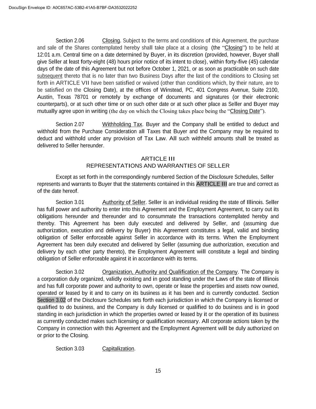 15 Section 2.06 Closing. Subject to the terms and conditions of this Agreement, the purchase and sale of the Shares contemplated hereby shall take place at a closing (the “Closing”) to be held at 12:01 a.m. Central time on a date determined by Buyer, in its discretion (provided, however, Buyer shall give Seller at least forty-eight (48) hours prior notice of its intent to close), within forty-five (45) calendar days of the date of this Agreement but not before October 1, 2021, or as soon as practicable on such date subsequent thereto that is no later than two Business Days after the last of the conditions to Closing set forth in ARTICLE VII have been satisfied or waived (other than conditions which, by their nature, are to be satisfied on the Closing Date), at the offices of Winstead, PC, 401 Congress Avenue, Suite 2100, Austin, Texas 78701 or remotely by exchange of documents and signatures (or their electronic counterparts), or at such other time or on such other date or at such other place as Seller and Buyer may mutually agree upon in writing (the day on which the Closing takes place being the “Closing Date”). Section 2.07 Withholding Tax. Buyer and the Company shall be entitled to deduct and withhold from the Purchase Consideration all Taxes that Buyer and the Company may be required to deduct and withhold under any provision of Tax Law. All such withheld amounts shall be treated as delivered to Seller hereunder. ARTICLE III REPRESENTATIONS AND WARRANTIES OF SELLER Except as set forth in the correspondingly numbered Section of the Disclosure Schedules, Seller represents and warrants to Buyer that the statements contained in this ARTICLE III are true and correct as of the date hereof. Section 3.01 Authority of Seller. Seller is an individual residing the state of Illinois. Seller has full power and authority to enter into this Agreement and the Employment Agreement, to carry out its obligations hereunder and thereunder and to consummate the transactions contemplated hereby and thereby. This Agreement has been duly executed and delivered by Seller, and (assuming due authorization, execution and delivery by Buyer) this Agreement constitutes a legal, valid and binding obligation of Seller enforceable against Seller in accordance with its terms. When the Employment Agreement has been duly executed and delivered by Seller (assuming due authorization, execution and delivery by each other party thereto), the Employment Agreement will constitute a legal and binding obligation of Seller enforceable against it in accordance with its terms. Section 3.02 Organization, Authority and Qualification of the Company. The Company is a corporation duly organized, validly existing and in good standing under the Laws of the state of Illinois and has full corporate power and authority to own, operate or lease the properties and assets now owned, operated or leased by it and to carry on its business as it has been and is currently conducted. Section Section 3.02 of the Disclosure Schedules sets forth each jurisdiction in which the Company is licensed or qualified to do business, and the Company is duly licensed or qualified to do business and is in good standing in each jurisdiction in which the properties owned or leased by it or the operation of its business as currently conducted makes such licensing or qualification necessary. All corporate actions taken by the Company in connection with this Agreement and the Employment Agreement will be duly authorized on or prior to the Closing. Section 3.03 Capitalization. DocuSign Envelope ID: A0C657AC-53B2-41A5-B7BF-DA3532022252