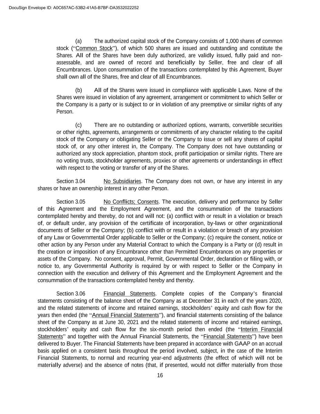 16 (a) The authorized capital stock of the Company consists of 1,000 shares of common stock (“Common Stock”), of which 500 shares are issued and outstanding and constitute the Shares. All of the Shares have been duly authorized, are validly issued, fully paid and non- assessable, and are owned of record and beneficially by Seller, free and clear of all Encumbrances. Upon consummation of the transactions contemplated by this Agreement, Buyer shall own all of the Shares, free and clear of all Encumbrances. (b) All of the Shares were issued in compliance with applicable Laws. None of the Shares were issued in violation of any agreement, arrangement or commitment to which Seller or the Company is a party or is subject to or in violation of any preemptive or similar rights of any Person. (c) There are no outstanding or authorized options, warrants, convertible securities or other rights, agreements, arrangements or commitments of any character relating to the capital stock of the Company or obligating Seller or the Company to issue or sell any shares of capital stock of, or any other interest in, the Company. The Company does not have outstanding or authorized any stock appreciation, phantom stock, profit participation or similar rights. There are no voting trusts, stockholder agreements, proxies or other agreements or understandings in effect with respect to the voting or transfer of any of the Shares. Section 3.04 No Subsidiaries. The Company does not own, or have any interest in any shares or have an ownership interest in any other Person. Section 3.05 No Conflicts; Consents. The execution, delivery and performance by Seller of this Agreement and the Employment Agreement, and the consummation of the transactions contemplated hereby and thereby, do not and will not: (a) conflict with or result in a violation or breach of, or default under, any provision of the certificate of incorporation, by-laws or other organizational documents of Seller or the Company; (b) conflict with or result in a violation or breach of any provision of any Law or Governmental Order applicable to Seller or the Company; (c) require the consent, notice or other action by any Person under any Material Contract to which the Company is a Party or (d) result in the creation or imposition of any Encumbrance other than Permitted Encumbrances on any properties or assets of the Company. No consent, approval, Permit, Governmental Order, declaration or filing with, or notice to, any Governmental Authority is required by or with respect to Seller or the Company in connection with the execution and delivery of this Agreement and the Employment Agreement and the consummation of the transactions contemplated hereby and thereby. Section 3.06 Financial Statements. Complete copies of the Company’s financial statements consisting of the balance sheet of the Company as at December 31 in each of the years 2020, and the related statements of income and retained earnings, stockholders’ equity and cash flow for the years then ended (the “Annual Financial Statements”), and financial statements consisting of the balance sheet of the Company as at June 30, 2021 and the related statements of income and retained earnings, stockholders’ equity and cash flow for the six-month period then ended (the “Interim Financial Statements” and together with the Annual Financial Statements, the “Financial Statements”) have been delivered to Buyer. The Financial Statements have been prepared in accordance with GAAP on an accrual basis applied on a consistent basis throughout the period involved, subject, in the case of the Interim Financial Statements, to normal and recurring year-end adjustments (the effect of which will not be materially adverse) and the absence of notes (that, if presented, would not differ materially from those DocuSign Envelope ID: A0C657AC-53B2-41A5-B7BF-DA3532022252