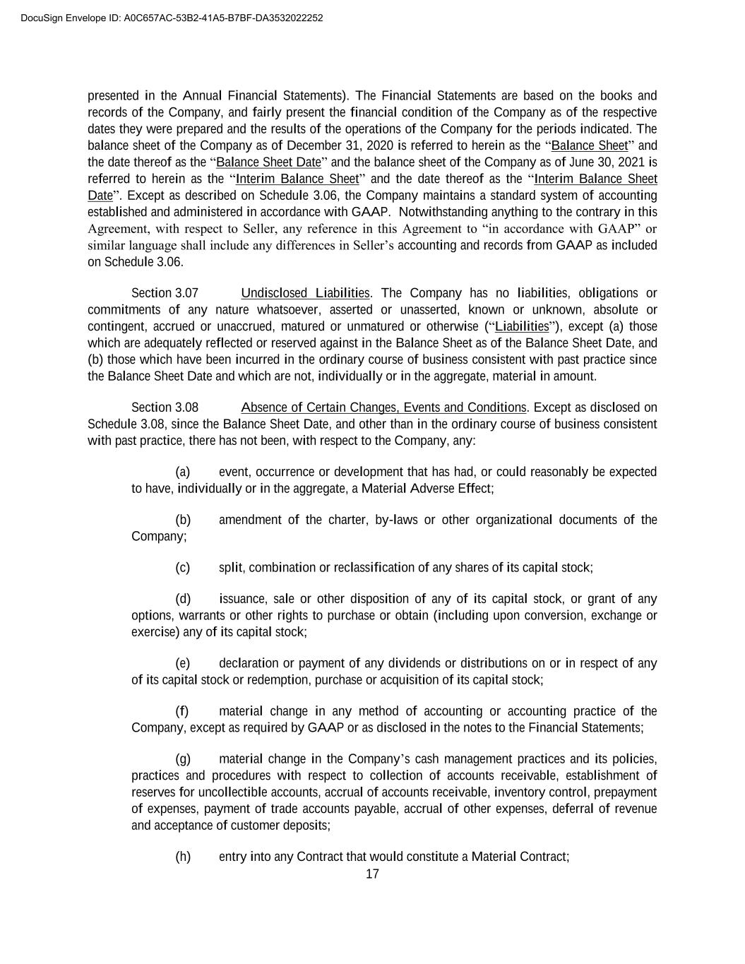17 presented in the Annual Financial Statements). The Financial Statements are based on the books and records of the Company, and fairly present the financial condition of the Company as of the respective dates they were prepared and the results of the operations of the Company for the periods indicated. The balance sheet of the Company as of December 31, 2020 is referred to herein as the “Balance Sheet” and the date thereof as the “Balance Sheet Date” and the balance sheet of the Company as of June 30, 2021 is referred to herein as the “Interim Balance Sheet” and the date thereof as the “Interim Balance Sheet Date”. Except as described on Schedule 3.06, the Company maintains a standard system of accounting established and administered in accordance with GAAP. Notwithstanding anything to the contrary in this Agreement, with respect to Seller, any reference in this Agreement to “in accordance with GAAP” or similar language shall include any differences in Seller’s accounting and records from GAAP as included on Schedule 3.06. Section 3.07 Undisclosed Liabilities. The Company has no liabilities, obligations or commitments of any nature whatsoever, asserted or unasserted, known or unknown, absolute or contingent, accrued or unaccrued, matured or unmatured or otherwise (“Liabilities”), except (a) those which are adequately reflected or reserved against in the Balance Sheet as of the Balance Sheet Date, and (b) those which have been incurred in the ordinary course of business consistent with past practice since the Balance Sheet Date and which are not, individually or in the aggregate, material in amount. Section 3.08 Absence of Certain Changes, Events and Conditions. Except as disclosed on Schedule 3.08, since the Balance Sheet Date, and other than in the ordinary course of business consistent with past practice, there has not been, with respect to the Company, any: (a) event, occurrence or development that has had, or could reasonably be expected to have, individually or in the aggregate, a Material Adverse Effect; (b) amendment of the charter, by-laws or other organizational documents of the Company; (c) split, combination or reclassification of any shares of its capital stock; (d) issuance, sale or other disposition of any of its capital stock, or grant of any options, warrants or other rights to purchase or obtain (including upon conversion, exchange or exercise) any of its capital stock; (e) declaration or payment of any dividends or distributions on or in respect of any of its capital stock or redemption, purchase or acquisition of its capital stock; (f) material change in any method of accounting or accounting practice of the Company, except as required by GAAP or as disclosed in the notes to the Financial Statements; (g) material change in the Company’s cash management practices and its policies, practices and procedures with respect to collection of accounts receivable, establishment of reserves for uncollectible accounts, accrual of accounts receivable, inventory control, prepayment of expenses, payment of trade accounts payable, accrual of other expenses, deferral of revenue and acceptance of customer deposits; (h) entry into any Contract that would constitute a Material Contract; DocuSign Envelope ID: A0C657AC-53B2-41A5-B7BF-DA3532022252
