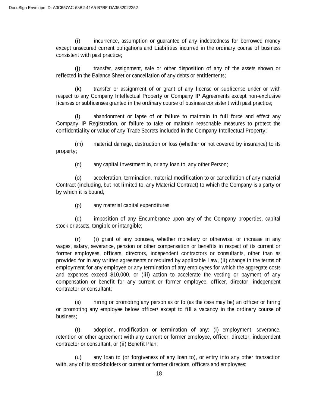 18 (i) incurrence, assumption or guarantee of any indebtedness for borrowed money except unsecured current obligations and Liabilities incurred in the ordinary course of business consistent with past practice; (j) transfer, assignment, sale or other disposition of any of the assets shown or reflected in the Balance Sheet or cancellation of any debts or entitlements; (k) transfer or assignment of or grant of any license or sublicense under or with respect to any Company Intellectual Property or Company IP Agreements except non-exclusive licenses or sublicenses granted in the ordinary course of business consistent with past practice; (l) abandonment or lapse of or failure to maintain in full force and effect any Company IP Registration, or failure to take or maintain reasonable measures to protect the confidentiality or value of any Trade Secrets included in the Company Intellectual Property; (m) material damage, destruction or loss (whether or not covered by insurance) to its property; (n) any capital investment in, or any loan to, any other Person; (o) acceleration, termination, material modification to or cancellation of any material Contract (including, but not limited to, any Material Contract) to which the Company is a party or by which it is bound; (p) any material capital expenditures; (q) imposition of any Encumbrance upon any of the Company properties, capital stock or assets, tangible or intangible; (r) (i) grant of any bonuses, whether monetary or otherwise, or increase in any wages, salary, severance, pension or other compensation or benefits in respect of its current or former employees, officers, directors, independent contractors or consultants, other than as provided for in any written agreements or required by applicable Law, (ii) change in the terms of employment for any employee or any termination of any employees for which the aggregate costs and expenses exceed $10,000, or (iii) action to accelerate the vesting or payment of any compensation or benefit for any current or former employee, officer, director, independent contractor or consultant; (s) hiring or promoting any person as or to (as the case may be) an officer or hiring or promoting any employee below officer/ except to fill a vacancy in the ordinary course of business; (t) adoption, modification or termination of any: (i) employment, severance, retention or other agreement with any current or former employee, officer, director, independent contractor or consultant, or (ii) Benefit Plan; (u) any loan to (or forgiveness of any loan to), or entry into any other transaction with, any of its stockholders or current or former directors, officers and employees; DocuSign Envelope ID: A0C657AC-53B2-41A5-B7BF-DA3532022252