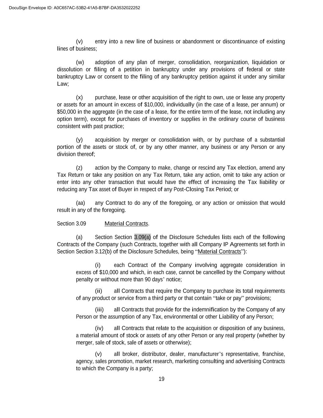 19 (v) entry into a new line of business or abandonment or discontinuance of existing lines of business; (w) adoption of any plan of merger, consolidation, reorganization, liquidation or dissolution or filing of a petition in bankruptcy under any provisions of federal or state bankruptcy Law or consent to the filing of any bankruptcy petition against it under any similar Law; (x) purchase, lease or other acquisition of the right to own, use or lease any property or assets for an amount in excess of $10,000, individually (in the case of a lease, per annum) or $50,000 in the aggregate (in the case of a lease, for the entire term of the lease, not including any option term), except for purchases of inventory or supplies in the ordinary course of business consistent with past practice; (y) acquisition by merger or consolidation with, or by purchase of a substantial portion of the assets or stock of, or by any other manner, any business or any Person or any division thereof; (z) action by the Company to make, change or rescind any Tax election, amend any Tax Return or take any position on any Tax Return, take any action, omit to take any action or enter into any other transaction that would have the effect of increasing the Tax liability or reducing any Tax asset of Buyer in respect of any Post-Closing Tax Period; or (aa) any Contract to do any of the foregoing, or any action or omission that would result in any of the foregoing. Section 3.09 Material Contracts. (a) Section Section 3.09(a) of the Disclosure Schedules lists each of the following Contracts of the Company (such Contracts, together with all Company IP Agreements set forth in Section Section 3.12(b) of the Disclosure Schedules, being “Material Contracts”): (i) each Contract of the Company involving aggregate consideration in excess of $10,000 and which, in each case, cannot be cancelled by the Company without penalty or without more than 90 days’ notice; (ii) all Contracts that require the Company to purchase its total requirements of any product or service from a third party or that contain “take or pay” provisions; (iii) all Contracts that provide for the indemnification by the Company of any Person or the assumption of any Tax, environmental or other Liability of any Person; (iv) all Contracts that relate to the acquisition or disposition of any business, a material amount of stock or assets of any other Person or any real property (whether by merger, sale of stock, sale of assets or otherwise); (v) all broker, distributor, dealer, manufacturer’s representative, franchise, agency, sales promotion, market research, marketing consulting and advertising Contracts to which the Company is a party; DocuSign Envelope ID: A0C657AC-53B2-41A5-B7BF-DA3532022252