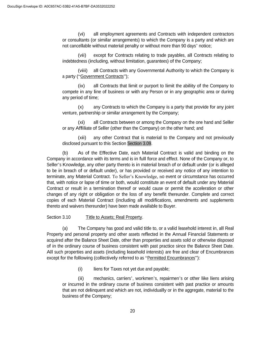 20 (vi) all employment agreements and Contracts with independent contractors or consultants (or similar arrangements) to which the Company is a party and which are not cancellable without material penalty or without more than 90 days’ notice; (vii) except for Contracts relating to trade payables, all Contracts relating to indebtedness (including, without limitation, guarantees) of the Company; (viii) all Contracts with any Governmental Authority to which the Company is a party (“Government Contracts”); (ix) all Contracts that limit or purport to limit the ability of the Company to compete in any line of business or with any Person or in any geographic area or during any period of time; (x) any Contracts to which the Company is a party that provide for any joint venture, partnership or similar arrangement by the Company; (xi) all Contracts between or among the Company on the one hand and Seller or any Affiliate of Seller (other than the Company) on the other hand; and (xii) any other Contract that is material to the Company and not previously disclosed pursuant to this Section Section 3.09. (b) As of the Effective Date, each Material Contract is valid and binding on the Company in accordance with its terms and is in full force and effect. None of the Company or, to Seller’s Knowledge, any other party thereto is in material breach of or default under (or is alleged to be in breach of or default under), or has provided or received any notice of any intention to terminate, any Material Contract. To Seller’s Knowledge, no event or circumstance has occurred that, with notice or lapse of time or both, would constitute an event of default under any Material Contract or result in a termination thereof or would cause or permit the acceleration or other changes of any right or obligation or the loss of any benefit thereunder. Complete and correct copies of each Material Contract (including all modifications, amendments and supplements thereto and waivers thereunder) have been made available to Buyer. Section 3.10 Title to Assets; Real Property. (a) The Company has good and valid title to, or a valid leasehold interest in, all Real Property and personal property and other assets reflected in the Annual Financial Statements or acquired after the Balance Sheet Date, other than properties and assets sold or otherwise disposed of in the ordinary course of business consistent with past practice since the Balance Sheet Date. All such properties and assets (including leasehold interests) are free and clear of Encumbrances except for the following (collectively referred to as “Permitted Encumbrances”): (i) liens for Taxes not yet due and payable; (ii) mechanics, carriers’, workmen’s, repairmen’s or other like liens arising or incurred in the ordinary course of business consistent with past practice or amounts that are not delinquent and which are not, individually or in the aggregate, material to the business of the Company; DocuSign Envelope ID: A0C657AC-53B2-41A5-B7BF-DA3532022252
