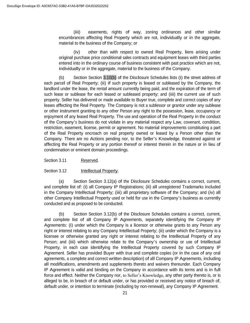 21 (iii) easements, rights of way, zoning ordinances and other similar encumbrances affecting Real Property which are not, individually or in the aggregate, material to the business of the Company; or (iv) other than with respect to owned Real Property, liens arising under original purchase price conditional sales contracts and equipment leases with third parties entered into in the ordinary course of business consistent with past practice which are not, individually or in the aggregate, material to the business of the Company. (b) Section Section 3.10(b) of the Disclosure Schedules lists (i) the street address of each parcel of Real Property; (ii) if such property is leased or subleased by the Company, the landlord under the lease, the rental amount currently being paid, and the expiration of the term of such lease or sublease for each leased or subleased property; and (iii) the current use of such property. Seller has delivered or made available to Buyer true, complete and correct copies of any leases affecting the Real Property. The Company is not a sublessor or grantor under any sublease or other instrument granting to any other Person any right to the possession, lease, occupancy or enjoyment of any leased Real Property. The use and operation of the Real Property in the conduct of the Company’s business do not violate in any material respect any Law, covenant, condition, restriction, easement, license, permit or agreement. No material improvements constituting a part of the Real Property encroach on real property owned or leased by a Person other than the Company. There are no Actions pending nor, to the Seller’s Knowledge, threatened against or affecting the Real Property or any portion thereof or interest therein in the nature or in lieu of condemnation or eminent domain proceedings. Section 3.11 Reserved. Section 3.12 Intellectual Property. (a) Section Section 3.12(a) of the Disclosure Schedules contains a correct, current, and complete list of: (i) all Company IP Registrations; (ii) all unregistered Trademarks included in the Company Intellectual Property; (iii) all proprietary software of the Company; and (iv) all other Company Intellectual Property used or held for use in the Company’s business as currently conducted and as proposed to be conducted. (b) Section Section 3.12(b) of the Disclosure Schedules contains a correct, current, and complete list of all Company IP Agreements, separately identifying the Company IP Agreements: (i) under which the Company is a licensor or otherwise grants to any Person any right or interest relating to any Company Intellectual Property; (ii) under which the Company is a licensee or otherwise granted any right or interest relating to the Intellectual Property of any Person; and (iii) which otherwise relate to the Company’s ownership or use of Intellectual Property, in each case identifying the Intellectual Property covered by such Company IP Agreement. Seller has provided Buyer with true and complete copies (or in the case of any oral agreements, a complete and correct written description) of all Company IP Agreements, including all modifications, amendments and supplements thereto and waivers thereunder. Each Company IP Agreement is valid and binding on the Company in accordance with its terms and is in full force and effect. Neither the Company nor, to Seller’s Knowledge, any other party thereto is, or is alleged to be, in breach of or default under, or has provided or received any notice of breach of, default under, or intention to terminate (including by non-renewal), any Company IP Agreement. DocuSign Envelope ID: A0C657AC-53B2-41A5-B7BF-DA3532022252