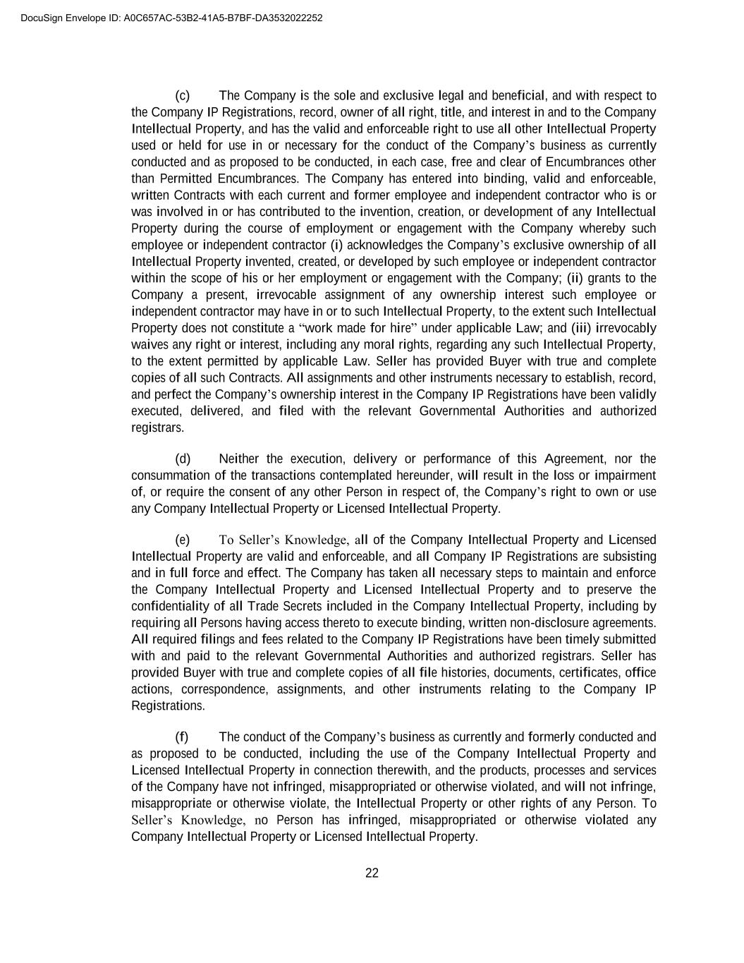 22 (c) The Company is the sole and exclusive legal and beneficial, and with respect to the Company IP Registrations, record, owner of all right, title, and interest in and to the Company Intellectual Property, and has the valid and enforceable right to use all other Intellectual Property used or held for use in or necessary for the conduct of the Company’s business as currently conducted and as proposed to be conducted, in each case, free and clear of Encumbrances other than Permitted Encumbrances. The Company has entered into binding, valid and enforceable, written Contracts with each current and former employee and independent contractor who is or was involved in or has contributed to the invention, creation, or development of any Intellectual Property during the course of employment or engagement with the Company whereby such employee or independent contractor (i) acknowledges the Company’s exclusive ownership of all Intellectual Property invented, created, or developed by such employee or independent contractor within the scope of his or her employment or engagement with the Company; (ii) grants to the Company a present, irrevocable assignment of any ownership interest such employee or independent contractor may have in or to such Intellectual Property, to the extent such Intellectual Property does not constitute a “work made for hire” under applicable Law; and (iii) irrevocably waives any right or interest, including any moral rights, regarding any such Intellectual Property, to the extent permitted by applicable Law. Seller has provided Buyer with true and complete copies of all such Contracts. All assignments and other instruments necessary to establish, record, and perfect the Company’s ownership interest in the Company IP Registrations have been validly executed, delivered, and filed with the relevant Governmental Authorities and authorized registrars. (d) Neither the execution, delivery or performance of this Agreement, nor the consummation of the transactions contemplated hereunder, will result in the loss or impairment of, or require the consent of any other Person in respect of, the Company’s right to own or use any Company Intellectual Property or Licensed Intellectual Property. (e) To Seller’s Knowledge, all of the Company Intellectual Property and Licensed Intellectual Property are valid and enforceable, and all Company IP Registrations are subsisting and in full force and effect. The Company has taken all necessary steps to maintain and enforce the Company Intellectual Property and Licensed Intellectual Property and to preserve the confidentiality of all Trade Secrets included in the Company Intellectual Property, including by requiring all Persons having access thereto to execute binding, written non-disclosure agreements. All required filings and fees related to the Company IP Registrations have been timely submitted with and paid to the relevant Governmental Authorities and authorized registrars. Seller has provided Buyer with true and complete copies of all file histories, documents, certificates, office actions, correspondence, assignments, and other instruments relating to the Company IP Registrations. (f) The conduct of the Company’s business as currently and formerly conducted and as proposed to be conducted, including the use of the Company Intellectual Property and Licensed Intellectual Property in connection therewith, and the products, processes and services of the Company have not infringed, misappropriated or otherwise violated, and will not infringe, misappropriate or otherwise violate, the Intellectual Property or other rights of any Person. To Seller’s Knowledge, no Person has infringed, misappropriated or otherwise violated any Company Intellectual Property or Licensed Intellectual Property. DocuSign Envelope ID: A0C657AC-53B2-41A5-B7BF-DA3532022252