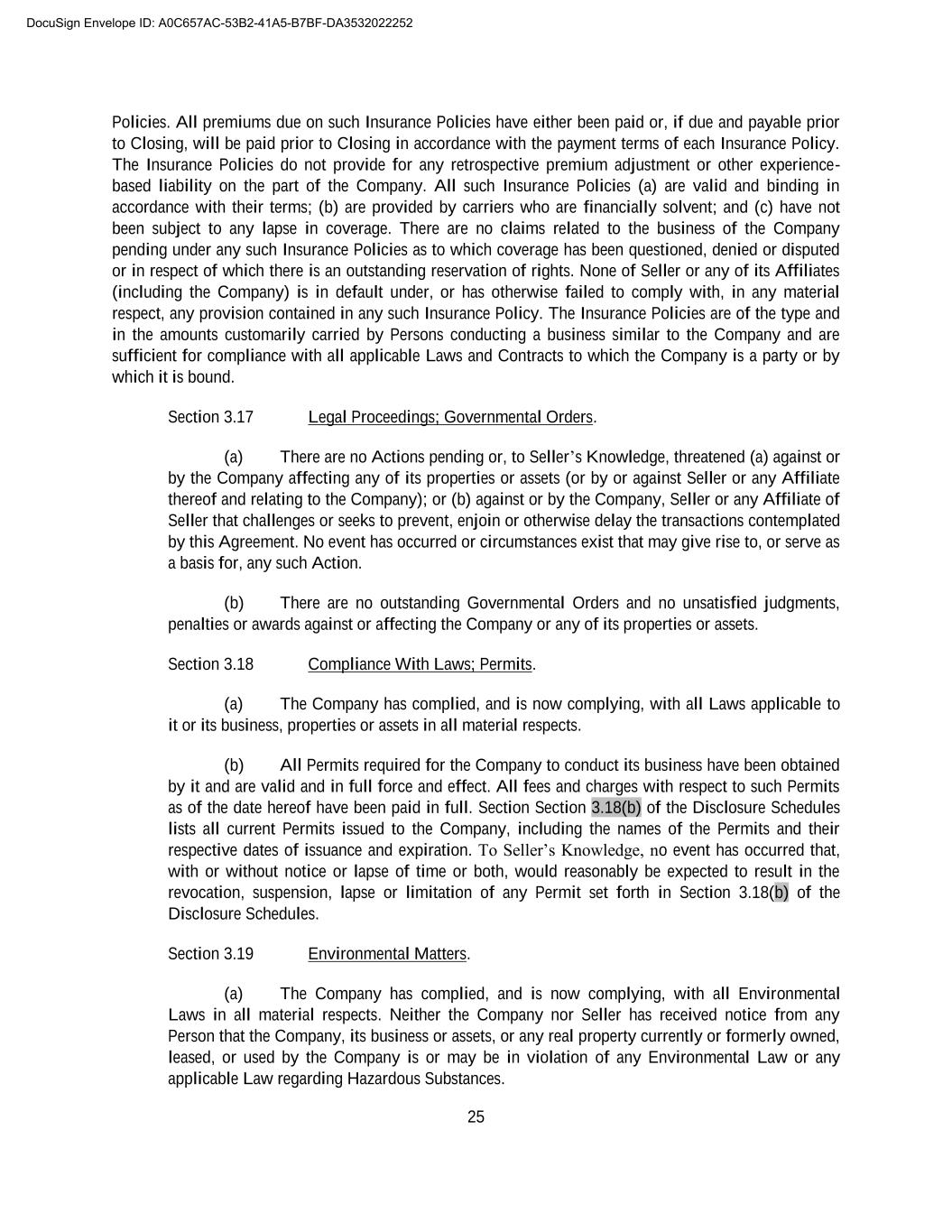 25 Policies. All premiums due on such Insurance Policies have either been paid or, if due and payable prior to Closing, will be paid prior to Closing in accordance with the payment terms of each Insurance Policy. The Insurance Policies do not provide for any retrospective premium adjustment or other experience- based liability on the part of the Company. All such Insurance Policies (a) are valid and binding in accordance with their terms; (b) are provided by carriers who are financially solvent; and (c) have not been subject to any lapse in coverage. There are no claims related to the business of the Company pending under any such Insurance Policies as to which coverage has been questioned, denied or disputed or in respect of which there is an outstanding reservation of rights. None of Seller or any of its Affiliates (including the Company) is in default under, or has otherwise failed to comply with, in any material respect, any provision contained in any such Insurance Policy. The Insurance Policies are of the type and in the amounts customarily carried by Persons conducting a business similar to the Company and are sufficient for compliance with all applicable Laws and Contracts to which the Company is a party or by which it is bound. Section 3.17 Legal Proceedings; Governmental Orders. (a) There are no Actions pending or, to Seller’s Knowledge, threatened (a) against or by the Company affecting any of its properties or assets (or by or against Seller or any Affiliate thereof and relating to the Company); or (b) against or by the Company, Seller or any Affiliate of Seller that challenges or seeks to prevent, enjoin or otherwise delay the transactions contemplated by this Agreement. No event has occurred or circumstances exist that may give rise to, or serve as a basis for, any such Action. (b) There are no outstanding Governmental Orders and no unsatisfied judgments, penalties or awards against or affecting the Company or any of its properties or assets. Section 3.18 Compliance With Laws; Permits. (a) The Company has complied, and is now complying, with all Laws applicable to it or its business, properties or assets in all material respects. (b) All Permits required for the Company to conduct its business have been obtained by it and are valid and in full force and effect. All fees and charges with respect to such Permits as of the date hereof have been paid in full. Section Section 3.18(b) of the Disclosure Schedules lists all current Permits issued to the Company, including the names of the Permits and their respective dates of issuance and expiration. To Seller’s Knowledge, no event has occurred that, with or without notice or lapse of time or both, would reasonably be expected to result in the revocation, suspension, lapse or limitation of any Permit set forth in Section 3.18(b) of the Disclosure Schedules. Section 3.19 Environmental Matters. (a) The Company has complied, and is now complying, with all Environmental Laws in all material respects. Neither the Company nor Seller has received notice from any Person that the Company, its business or assets, or any real property currently or formerly owned, leased, or used by the Company is or may be in violation of any Environmental Law or any applicable Law regarding Hazardous Substances. DocuSign Envelope ID: A0C657AC-53B2-41A5-B7BF-DA3532022252