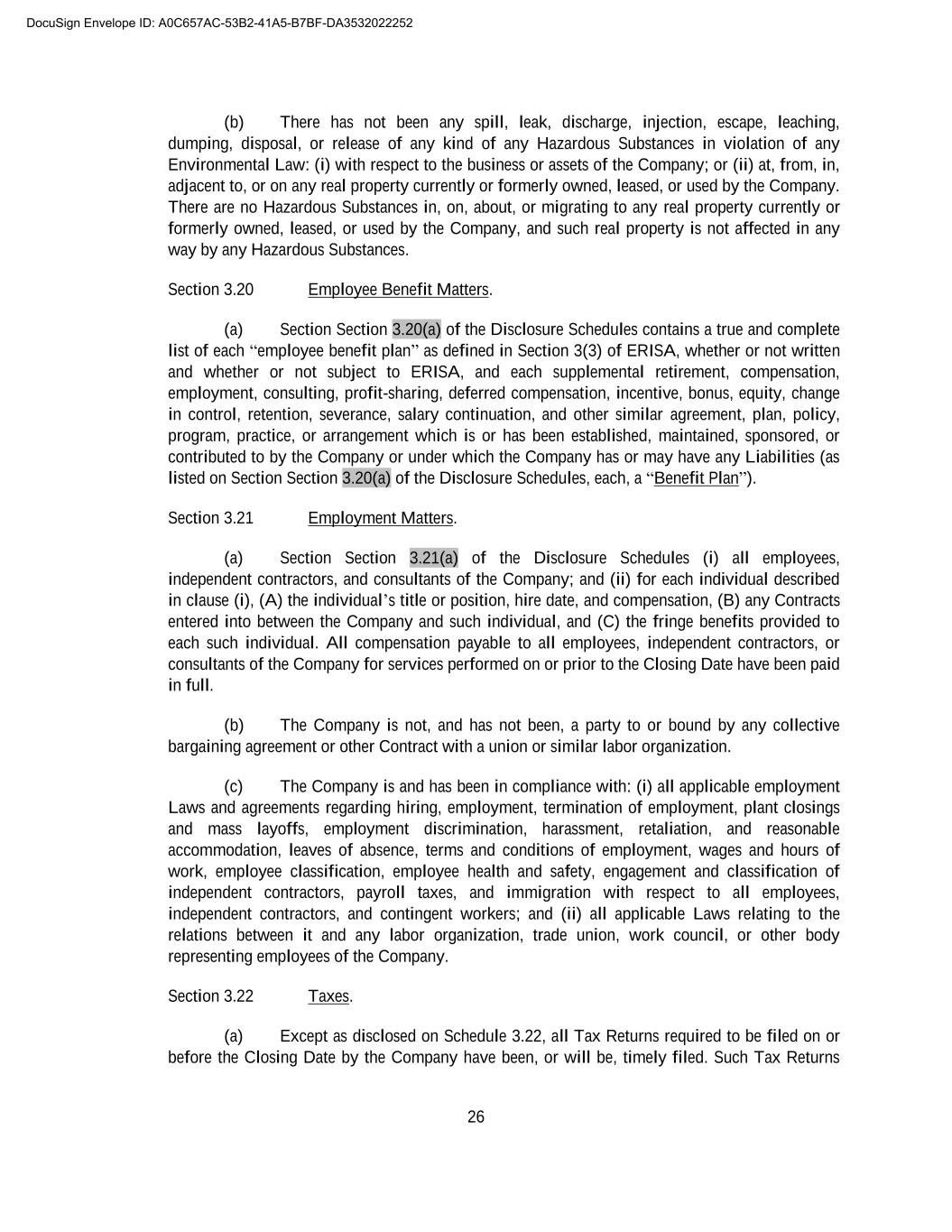 26 (b) There has not been any spill, leak, discharge, injection, escape, leaching, dumping, disposal, or release of any kind of any Hazardous Substances in violation of any Environmental Law: (i) with respect to the business or assets of the Company; or (ii) at, from, in, adjacent to, or on any real property currently or formerly owned, leased, or used by the Company. There are no Hazardous Substances in, on, about, or migrating to any real property currently or formerly owned, leased, or used by the Company, and such real property is not affected in any way by any Hazardous Substances. Section 3.20 Employee Benefit Matters. (a) Section Section 3.20(a) of the Disclosure Schedules contains a true and complete list of each “employee benefit plan” as defined in Section 3(3) of ERISA, whether or not written and whether or not subject to ERISA, and each supplemental retirement, compensation, employment, consulting, profit-sharing, deferred compensation, incentive, bonus, equity, change in control, retention, severance, salary continuation, and other similar agreement, plan, policy, program, practice, or arrangement which is or has been established, maintained, sponsored, or contributed to by the Company or under which the Company has or may have any Liabilities (as listed on Section Section 3.20(a) of the Disclosure Schedules, each, a “Benefit Plan”). Section 3.21 Employment Matters. (a) Section Section 3.21(a) of the Disclosure Schedules (i) all employees, independent contractors, and consultants of the Company; and (ii) for each individual described in clause (i), (A) the individual’s title or position, hire date, and compensation, (B) any Contracts entered into between the Company and such individual, and (C) the fringe benefits provided to each such individual. All compensation payable to all employees, independent contractors, or consultants of the Company for services performed on or prior to the Closing Date have been paid in full. (b) The Company is not, and has not been, a party to or bound by any collective bargaining agreement or other Contract with a union or similar labor organization. (c) The Company is and has been in compliance with: (i) all applicable employment Laws and agreements regarding hiring, employment, termination of employment, plant closings and mass layoffs, employment discrimination, harassment, retaliation, and reasonable accommodation, leaves of absence, terms and conditions of employment, wages and hours of work, employee classification, employee health and safety, engagement and classification of independent contractors, payroll taxes, and immigration with respect to all employees, independent contractors, and contingent workers; and (ii) all applicable Laws relating to the relations between it and any labor organization, trade union, work council, or other body representing employees of the Company. Section 3.22 Taxes. (a) Except as disclosed on Schedule 3.22, all Tax Returns required to be filed on or before the Closing Date by the Company have been, or will be, timely filed. Such Tax Returns DocuSign Envelope ID: A0C657AC-53B2-41A5-B7BF-DA3532022252