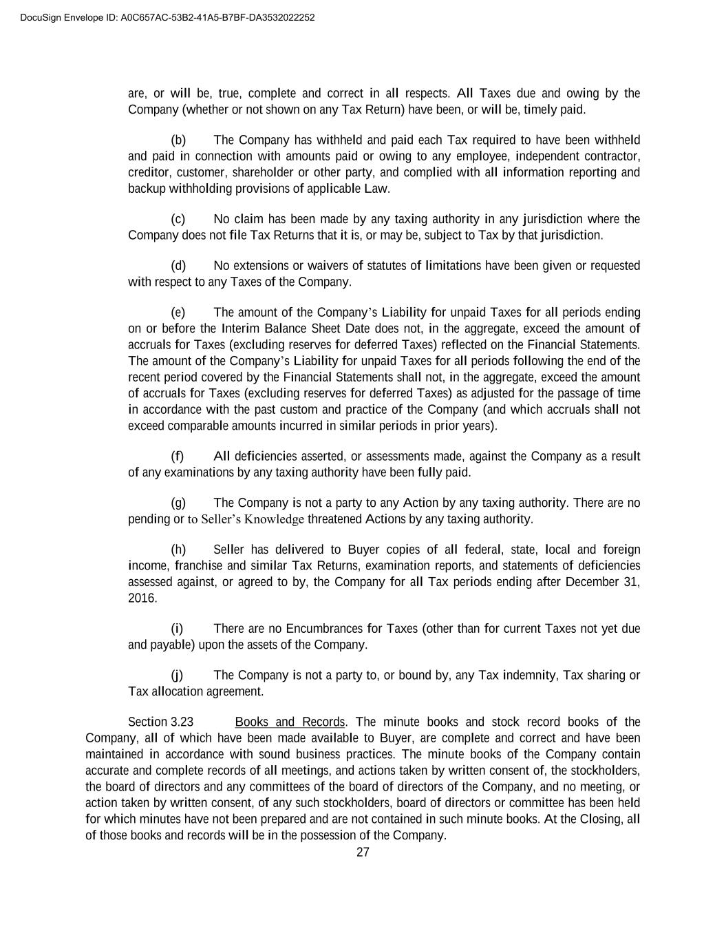27 are, or will be, true, complete and correct in all respects. All Taxes due and owing by the Company (whether or not shown on any Tax Return) have been, or will be, timely paid. (b) The Company has withheld and paid each Tax required to have been withheld and paid in connection with amounts paid or owing to any employee, independent contractor, creditor, customer, shareholder or other party, and complied with all information reporting and backup withholding provisions of applicable Law. (c) No claim has been made by any taxing authority in any jurisdiction where the Company does not file Tax Returns that it is, or may be, subject to Tax by that jurisdiction. (d) No extensions or waivers of statutes of limitations have been given or requested with respect to any Taxes of the Company. (e) The amount of the Company’s Liability for unpaid Taxes for all periods ending on or before the Interim Balance Sheet Date does not, in the aggregate, exceed the amount of accruals for Taxes (excluding reserves for deferred Taxes) reflected on the Financial Statements. The amount of the Company’s Liability for unpaid Taxes for all periods following the end of the recent period covered by the Financial Statements shall not, in the aggregate, exceed the amount of accruals for Taxes (excluding reserves for deferred Taxes) as adjusted for the passage of time in accordance with the past custom and practice of the Company (and which accruals shall not exceed comparable amounts incurred in similar periods in prior years). (f) All deficiencies asserted, or assessments made, against the Company as a result of any examinations by any taxing authority have been fully paid. (g) The Company is not a party to any Action by any taxing authority. There are no pending or to Seller’s Knowledge threatened Actions by any taxing authority. (h) Seller has delivered to Buyer copies of all federal, state, local and foreign income, franchise and similar Tax Returns, examination reports, and statements of deficiencies assessed against, or agreed to by, the Company for all Tax periods ending after December 31, 2016. (i) There are no Encumbrances for Taxes (other than for current Taxes not yet due and payable) upon the assets of the Company. (j) The Company is not a party to, or bound by, any Tax indemnity, Tax sharing or Tax allocation agreement. Section 3.23 Books and Records. The minute books and stock record books of the Company, all of which have been made available to Buyer, are complete and correct and have been maintained in accordance with sound business practices. The minute books of the Company contain accurate and complete records of all meetings, and actions taken by written consent of, the stockholders, the board of directors and any committees of the board of directors of the Company, and no meeting, or action taken by written consent, of any such stockholders, board of directors or committee has been held for which minutes have not been prepared and are not contained in such minute books. At the Closing, all of those books and records will be in the possession of the Company. DocuSign Envelope ID: A0C657AC-53B2-41A5-B7BF-DA3532022252