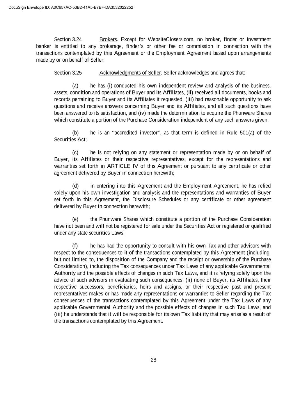 28 Section 3.24 Brokers. Except for WebsiteClosers.com, no broker, finder or investment banker is entitled to any brokerage, finder’s or other fee or commission in connection with the transactions contemplated by this Agreement or the Employment Agreement based upon arrangements made by or on behalf of Seller. Section 3.25 Acknowledgments of Seller. Seller acknowledges and agrees that: (a) he has (i) conducted his own independent review and analysis of the business, assets, condition and operations of Buyer and its Affiliates, (ii) received all documents, books and records pertaining to Buyer and its Affiliates it requested, (iii) had reasonable opportunity to ask questions and receive answers concerning Buyer and its Affiliates, and all such questions have been answered to its satisfaction, and (iv) made the determination to acquire the Phunware Shares which constitute a portion of the Purchase Consideration independent of any such answers given; (b) he is an “accredited investor”, as that term is defined in Rule 501(a) of the Securities Act; (c) he is not relying on any statement or representation made by or on behalf of Buyer, its Affiliates or their respective representatives, except for the representations and warranties set forth in ARTICLE IV of this Agreement or pursuant to any certificate or other agreement delivered by Buyer in connection herewith; (d) in entering into this Agreement and the Employment Agreement, he has relied solely upon his own investigation and analysis and the representations and warranties of Buyer set forth in this Agreement, the Disclosure Schedules or any certificate or other agreement delivered by Buyer in connection herewith; (e) the Phunware Shares which constitute a portion of the Purchase Consideration have not been and will not be registered for sale under the Securities Act or registered or qualified under any state securities Laws; (f) he has had the opportunity to consult with his own Tax and other advisors with respect to the consequences to it of the transactions contemplated by this Agreement (including, but not limited to, the disposition of the Company and the receipt or ownership of the Purchase Consideration), including the Tax consequences under Tax Laws of any applicable Governmental Authority and the possible effects of changes in such Tax Laws, and it is relying solely upon the advice of such advisors in evaluating such consequences, (ii) none of Buyer, its Affiliates, their respective successors, beneficiaries, heirs and assigns, or their respective past and present representatives makes or has made any representations or warranties to Seller regarding the Tax consequences of the transactions contemplated by this Agreement under the Tax Laws of any applicable Governmental Authority and the possible effects of changes in such Tax Laws, and (iii) he understands that it will be responsible for its own Tax liability that may arise as a result of the transactions contemplated by this Agreement. DocuSign Envelope ID: A0C657AC-53B2-41A5-B7BF-DA3532022252