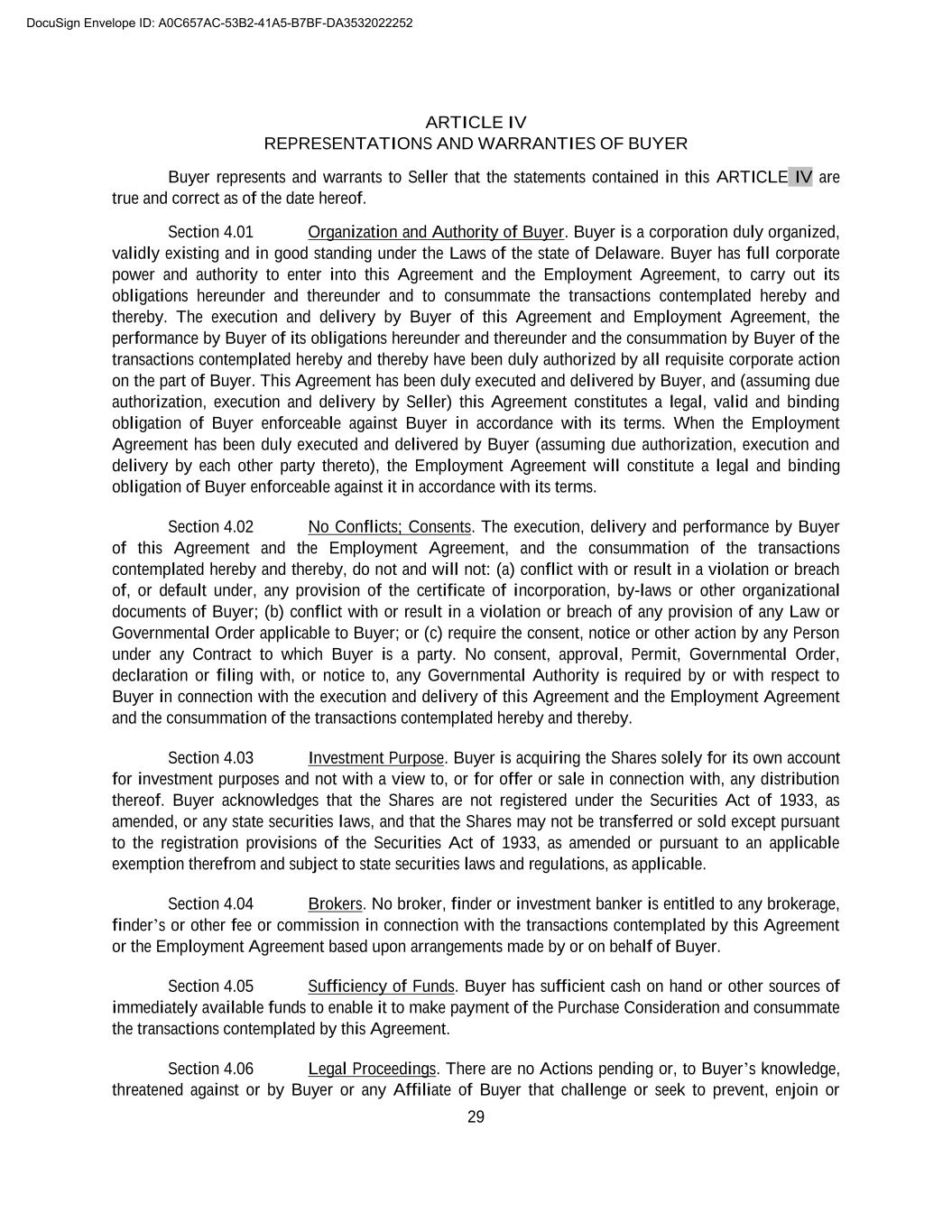 29 ARTICLE IV REPRESENTATIONS AND WARRANTIES OF BUYER Buyer represents and warrants to Seller that the statements contained in this ARTICLE IV are true and correct as of the date hereof. Section 4.01 Organization and Authority of Buyer. Buyer is a corporation duly organized, validly existing and in good standing under the Laws of the state of Delaware. Buyer has full corporate power and authority to enter into this Agreement and the Employment Agreement, to carry out its obligations hereunder and thereunder and to consummate the transactions contemplated hereby and thereby. The execution and delivery by Buyer of this Agreement and Employment Agreement, the performance by Buyer of its obligations hereunder and thereunder and the consummation by Buyer of the transactions contemplated hereby and thereby have been duly authorized by all requisite corporate action on the part of Buyer. This Agreement has been duly executed and delivered by Buyer, and (assuming due authorization, execution and delivery by Seller) this Agreement constitutes a legal, valid and binding obligation of Buyer enforceable against Buyer in accordance with its terms. When the Employment Agreement has been duly executed and delivered by Buyer (assuming due authorization, execution and delivery by each other party thereto), the Employment Agreement will constitute a legal and binding obligation of Buyer enforceable against it in accordance with its terms. Section 4.02 No Conflicts; Consents. The execution, delivery and performance by Buyer of this Agreement and the Employment Agreement, and the consummation of the transactions contemplated hereby and thereby, do not and will not: (a) conflict with or result in a violation or breach of, or default under, any provision of the certificate of incorporation, by-laws or other organizational documents of Buyer; (b) conflict with or result in a violation or breach of any provision of any Law or Governmental Order applicable to Buyer; or (c) require the consent, notice or other action by any Person under any Contract to which Buyer is a party. No consent, approval, Permit, Governmental Order, declaration or filing with, or notice to, any Governmental Authority is required by or with respect to Buyer in connection with the execution and delivery of this Agreement and the Employment Agreement and the consummation of the transactions contemplated hereby and thereby. Section 4.03 Investment Purpose. Buyer is acquiring the Shares solely for its own account for investment purposes and not with a view to, or for offer or sale in connection with, any distribution thereof. Buyer acknowledges that the Shares are not registered under the Securities Act of 1933, as amended, or any state securities laws, and that the Shares may not be transferred or sold except pursuant to the registration provisions of the Securities Act of 1933, as amended or pursuant to an applicable exemption therefrom and subject to state securities laws and regulations, as applicable. Section 4.04 Brokers. No broker, finder or investment banker is entitled to any brokerage, finder’s or other fee or commission in connection with the transactions contemplated by this Agreement or the Employment Agreement based upon arrangements made by or on behalf of Buyer. Section 4.05 Sufficiency of Funds. Buyer has sufficient cash on hand or other sources of immediately available funds to enable it to make payment of the Purchase Consideration and consummate the transactions contemplated by this Agreement. Section 4.06 Legal Proceedings. There are no Actions pending or, to Buyer’s knowledge, threatened against or by Buyer or any Affiliate of Buyer that challenge or seek to prevent, enjoin or DocuSign Envelope ID: A0C657AC-53B2-41A5-B7BF-DA3532022252