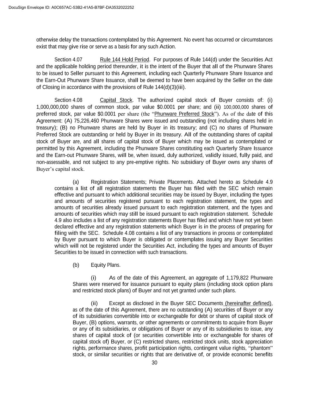 30 otherwise delay the transactions contemplated by this Agreement. No event has occurred or circumstances exist that may give rise or serve as a basis for any such Action. Section 4.07 Rule 144 Hold Period. For purposes of Rule 144(d) under the Securities Act and the applicable holding period thereunder, it is the intent of the Buyer that all of the Phunware Shares to be issued to Seller pursuant to this Agreement, including each Quarterly Phunware Share Issuance and the Earn-Out Phunware Share Issuance, shall be deemed to have been acquired by the Seller on the date of Closing in accordance with the provisions of Rule 144(d)(3)(iii). Section 4.08 Capital Stock. The authorized capital stock of Buyer consists of: (i) 1,000,000,000 shares of common stock, par value $0.0001 per share; and (ii) 100,000,000 shares of preferred stock, par value $0.0001 per share (the “Phunware Preferred Stock”). As of the date of this Agreement: (A) 75,226,460 Phunware Shares were issued and outstanding (not including shares held in treasury); (B) no Phunware shares are held by Buyer in its treasury; and (C) no shares of Phunware Preferred Stock are outstanding or held by Buyer in its treasury. All of the outstanding shares of capital stock of Buyer are, and all shares of capital stock of Buyer which may be issued as contemplated or permitted by this Agreement, including the Phunware Shares constituting each Quarterly Share Issuance and the Earn-out Phunware Shares, will be, when issued, duly authorized, validly issued, fully paid, and non-assessable, and not subject to any pre-emptive rights. No subsidiary of Buyer owns any shares of Buyer’s capital stock. (a) Registration Statements; Private Placements. Attached hereto as Schedule 4.9 contains a list of all registration statements the Buyer has filed with the SEC which remain effective and pursuant to which additional securities may be issued by Buyer, including the types and amounts of securities registered pursuant to each registration statement, the types and amounts of securities already issued pursuant to each registration statement, and the types and amounts of securities which may still be issued pursuant to each registration statement. Schedule 4.9 also includes a list of any registration statements Buyer has filed and which have not yet been declared effective and any registration statements which Buyer is in the process of preparing for filing with the SEC. Schedule 4.08 contains a list of any transactions in process or contemplated by Buyer pursuant to which Buyer is obligated or contemplates issuing any Buyer Securities which will not be registered under the Securities Act, including the types and amounts of Buyer Securities to be issued in connection with such transactions. (b) Equity Plans. (i) As of the date of this Agreement, an aggregate of 1,179,822 Phunware Shares were reserved for issuance pursuant to equity plans (including stock option plans and restricted stock plans) of Buyer and not yet granted under such plans. (ii) Except as disclosed in the Buyer SEC Documents (hereinafter defined), as of the date of this Agreement, there are no outstanding (A) securities of Buyer or any of its subsidiaries convertible into or exchangeable for debt or shares of capital stock of Buyer, (B) options, warrants, or other agreements or commitments to acquire from Buyer or any of its subsidiaries, or obligations of Buyer or any of its subsidiaries to issue, any shares of capital stock of (or securities convertible into or exchangeable for shares of capital stock of) Buyer, or (C) restricted shares, restricted stock units, stock appreciation rights, performance shares, profit participation rights, contingent value rights, “phantom” stock, or similar securities or rights that are derivative of, or provide economic benefits DocuSign Envelope ID: A0C657AC-53B2-41A5-B7BF-DA3532022252