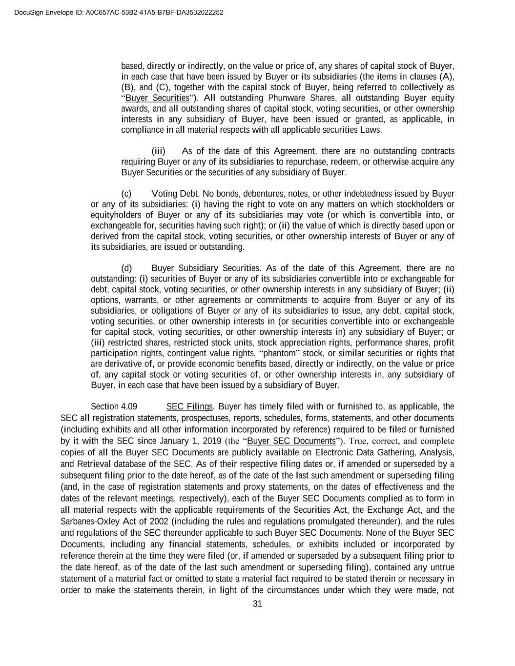 31 based, directly or indirectly, on the value or price of, any shares of capital stock of Buyer, in each case that have been issued by Buyer or its subsidiaries (the items in clauses (A), (B), and (C), together with the capital stock of Buyer, being referred to collectively as “Buyer Securities”). All outstanding Phunware Shares, all outstanding Buyer equity awards, and all outstanding shares of capital stock, voting securities, or other ownership interests in any subsidiary of Buyer, have been issued or granted, as applicable, in compliance in all material respects with all applicable securities Laws. (iii) As of the date of this Agreement, there are no outstanding contracts requiring Buyer or any of its subsidiaries to repurchase, redeem, or otherwise acquire any Buyer Securities or the securities of any subsidiary of Buyer. (c) Voting Debt. No bonds, debentures, notes, or other indebtedness issued by Buyer or any of its subsidiaries: (i) having the right to vote on any matters on which stockholders or equityholders of Buyer or any of its subsidiaries may vote (or which is convertible into, or exchangeable for, securities having such right); or (ii) the value of which is directly based upon or derived from the capital stock, voting securities, or other ownership interests of Buyer or any of its subsidiaries, are issued or outstanding. (d) Buyer Subsidiary Securities. As of the date of this Agreement, there are no outstanding: (i) securities of Buyer or any of its subsidiaries convertible into or exchangeable for debt, capital stock, voting securities, or other ownership interests in any subsidiary of Buyer; (ii) options, warrants, or other agreements or commitments to acquire from Buyer or any of its subsidiaries, or obligations of Buyer or any of its subsidiaries to issue, any debt, capital stock, voting securities, or other ownership interests in (or securities convertible into or exchangeable for capital stock, voting securities, or other ownership interests in) any subsidiary of Buyer; or (iii) restricted shares, restricted stock units, stock appreciation rights, performance shares, profit participation rights, contingent value rights, “phantom” stock, or similar securities or rights that are derivative of, or provide economic benefits based, directly or indirectly, on the value or price of, any capital stock or voting securities of, or other ownership interests in, any subsidiary of Buyer, in each case that have been issued by a subsidiary of Buyer. Section 4.09 SEC Filings. Buyer has timely filed with or furnished to, as applicable, the SEC all registration statements, prospectuses, reports, schedules, forms, statements, and other documents (including exhibits and all other information incorporated by reference) required to be filed or furnished by it with the SEC since January 1, 2019 (the “Buyer SEC Documents”). True, correct, and complete copies of all the Buyer SEC Documents are publicly available on Electronic Data Gathering, Analysis, and Retrieval database of the SEC. As of their respective filing dates or, if amended or superseded by a subsequent filing prior to the date hereof, as of the date of the last such amendment or superseding filing (and, in the case of registration statements and proxy statements, on the dates of effectiveness and the dates of the relevant meetings, respectively), each of the Buyer SEC Documents complied as to form in all material respects with the applicable requirements of the Securities Act, the Exchange Act, and the Sarbanes-Oxley Act of 2002 (including the rules and regulations promulgated thereunder), and the rules and regulations of the SEC thereunder applicable to such Buyer SEC Documents. None of the Buyer SEC Documents, including any financial statements, schedules, or exhibits included or incorporated by reference therein at the time they were filed (or, if amended or superseded by a subsequent filing prior to the date hereof, as of the date of the last such amendment or superseding filing), contained any untrue statement of a material fact or omitted to state a material fact required to be stated therein or necessary in order to make the statements therein, in light of the circumstances under which they were made, not DocuSign Envelope ID: A0C657AC-53B2-41A5-B7BF-DA3532022252