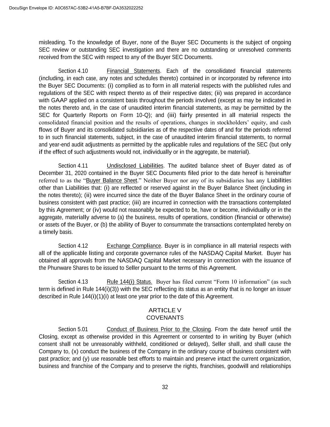 32 misleading. To the knowledge of Buyer, none of the Buyer SEC Documents is the subject of ongoing SEC review or outstanding SEC investigation and there are no outstanding or unresolved comments received from the SEC with respect to any of the Buyer SEC Documents. Section 4.10 Financial Statements. Each of the consolidated financial statements (including, in each case, any notes and schedules thereto) contained in or incorporated by reference into the Buyer SEC Documents: (i) complied as to form in all material respects with the published rules and regulations of the SEC with respect thereto as of their respective dates; (ii) was prepared in accordance with GAAP applied on a consistent basis throughout the periods involved (except as may be indicated in the notes thereto and, in the case of unaudited interim financial statements, as may be permitted by the SEC for Quarterly Reports on Form 10-Q); and (iii) fairly presented in all material respects the consolidated financial position and the results of operations, changes in stockholders’ equity, and cash flows of Buyer and its consolidated subsidiaries as of the respective dates of and for the periods referred to in such financial statements, subject, in the case of unaudited interim financial statements, to normal and year-end audit adjustments as permitted by the applicable rules and regulations of the SEC (but only if the effect of such adjustments would not, individually or in the aggregate, be material). Section 4.11 Undisclosed Liabilities. The audited balance sheet of Buyer dated as of December 31, 2020 contained in the Buyer SEC Documents filed prior to the date hereof is hereinafter referred to as the “Buyer Balance Sheet.” Neither Buyer nor any of its subsidiaries has any Liabilities other than Liabilities that: (i) are reflected or reserved against in the Buyer Balance Sheet (including in the notes thereto); (ii) were incurred since the date of the Buyer Balance Sheet in the ordinary course of business consistent with past practice; (iii) are incurred in connection with the transactions contemplated by this Agreement; or (iv) would not reasonably be expected to be, have or become, individually or in the aggregate, materially adverse to (a) the business, results of operations, condition (financial or otherwise) or assets of the Buyer, or (b) the ability of Buyer to consummate the transactions contemplated hereby on a timely basis. Section 4.12 Exchange Compliance. Buyer is in compliance in all material respects with all of the applicable listing and corporate governance rules of the NASDAQ Capital Market. Buyer has obtained all approvals from the NASDAQ Capital Market necessary in connection with the issuance of the Phunware Shares to be issued to Seller pursuant to the terms of this Agreement. Section 4.13 Rule 144(i) Status. Buyer has filed current “Form 10 information” (as such term is defined in Rule 144(i)(3)) with the SEC reflecting its status as an entity that is no longer an issuer described in Rule 144(i)(1)(i) at least one year prior to the date of this Agreement. ARTICLE V COVENANTS Section 5.01 Conduct of Business Prior to the Closing. From the date hereof until the Closing, except as otherwise provided in this Agreement or consented to in writing by Buyer (which consent shall not be unreasonably withheld, conditioned or delayed), Seller shall, and shall cause the Company to, (x) conduct the business of the Company in the ordinary course of business consistent with past practice; and (y) use reasonable best efforts to maintain and preserve intact the current organization, business and franchise of the Company and to preserve the rights, franchises, goodwill and relationships DocuSign Envelope ID: A0C657AC-53B2-41A5-B7BF-DA3532022252