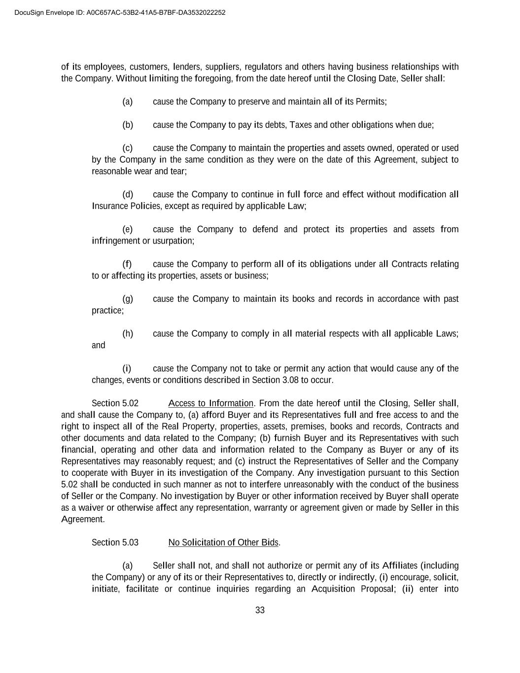 33 of its employees, customers, lenders, suppliers, regulators and others having business relationships with the Company. Without limiting the foregoing, from the date hereof until the Closing Date, Seller shall: (a) cause the Company to preserve and maintain all of its Permits; (b) cause the Company to pay its debts, Taxes and other obligations when due; (c) cause the Company to maintain the properties and assets owned, operated or used by the Company in the same condition as they were on the date of this Agreement, subject to reasonable wear and tear; (d) cause the Company to continue in full force and effect without modification all Insurance Policies, except as required by applicable Law; (e) cause the Company to defend and protect its properties and assets from infringement or usurpation; (f) cause the Company to perform all of its obligations under all Contracts relating to or affecting its properties, assets or business; (g) cause the Company to maintain its books and records in accordance with past practice; (h) cause the Company to comply in all material respects with all applicable Laws; and (i) cause the Company not to take or permit any action that would cause any of the changes, events or conditions described in Section 3.08 to occur. Section 5.02 Access to Information. From the date hereof until the Closing, Seller shall, and shall cause the Company to, (a) afford Buyer and its Representatives full and free access to and the right to inspect all of the Real Property, properties, assets, premises, books and records, Contracts and other documents and data related to the Company; (b) furnish Buyer and its Representatives with such financial, operating and other data and information related to the Company as Buyer or any of its Representatives may reasonably request; and (c) instruct the Representatives of Seller and the Company to cooperate with Buyer in its investigation of the Company. Any investigation pursuant to this Section 5.02 shall be conducted in such manner as not to interfere unreasonably with the conduct of the business of Seller or the Company. No investigation by Buyer or other information received by Buyer shall operate as a waiver or otherwise affect any representation, warranty or agreement given or made by Seller in this Agreement. Section 5.03 No Solicitation of Other Bids. (a) Seller shall not, and shall not authorize or permit any of its Affiliates (including the Company) or any of its or their Representatives to, directly or indirectly, (i) encourage, solicit, initiate, facilitate or continue inquiries regarding an Acquisition Proposal; (ii) enter into DocuSign Envelope ID: A0C657AC-53B2-41A5-B7BF-DA3532022252