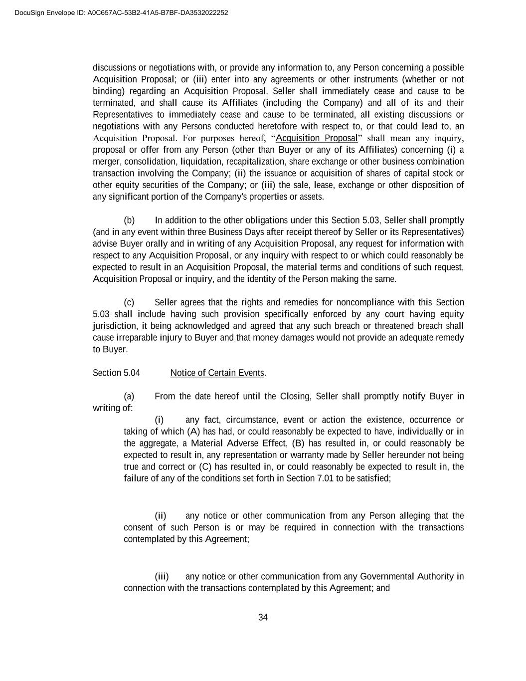 34 discussions or negotiations with, or provide any information to, any Person concerning a possible Acquisition Proposal; or (iii) enter into any agreements or other instruments (whether or not binding) regarding an Acquisition Proposal. Seller shall immediately cease and cause to be terminated, and shall cause its Affiliates (including the Company) and all of its and their Representatives to immediately cease and cause to be terminated, all existing discussions or negotiations with any Persons conducted heretofore with respect to, or that could lead to, an Acquisition Proposal. For purposes hereof, “Acquisition Proposal” shall mean any inquiry, proposal or offer from any Person (other than Buyer or any of its Affiliates) concerning (i) a merger, consolidation, liquidation, recapitalization, share exchange or other business combination transaction involving the Company; (ii) the issuance or acquisition of shares of capital stock or other equity securities of the Company; or (iii) the sale, lease, exchange or other disposition of any significant portion of the Company's properties or assets. (b) In addition to the other obligations under this Section 5.03, Seller shall promptly (and in any event within three Business Days after receipt thereof by Seller or its Representatives) advise Buyer orally and in writing of any Acquisition Proposal, any request for information with respect to any Acquisition Proposal, or any inquiry with respect to or which could reasonably be expected to result in an Acquisition Proposal, the material terms and conditions of such request, Acquisition Proposal or inquiry, and the identity of the Person making the same. (c) Seller agrees that the rights and remedies for noncompliance with this Section 5.03 shall include having such provision specifically enforced by any court having equity jurisdiction, it being acknowledged and agreed that any such breach or threatened breach shall cause irreparable injury to Buyer and that money damages would not provide an adequate remedy to Buyer. Section 5.04 Notice of Certain Events. (a) From the date hereof until the Closing, Seller shall promptly notify Buyer in writing of: (i) any fact, circumstance, event or action the existence, occurrence or taking of which (A) has had, or could reasonably be expected to have, individually or in the aggregate, a Material Adverse Effect, (B) has resulted in, or could reasonably be expected to result in, any representation or warranty made by Seller hereunder not being true and correct or (C) has resulted in, or could reasonably be expected to result in, the failure of any of the conditions set forth in Section 7.01 to be satisfied; (ii) any notice or other communication from any Person alleging that the consent of such Person is or may be required in connection with the transactions contemplated by this Agreement; (iii) any notice or other communication from any Governmental Authority in connection with the transactions contemplated by this Agreement; and DocuSign Envelope ID: A0C657AC-53B2-41A5-B7BF-DA3532022252