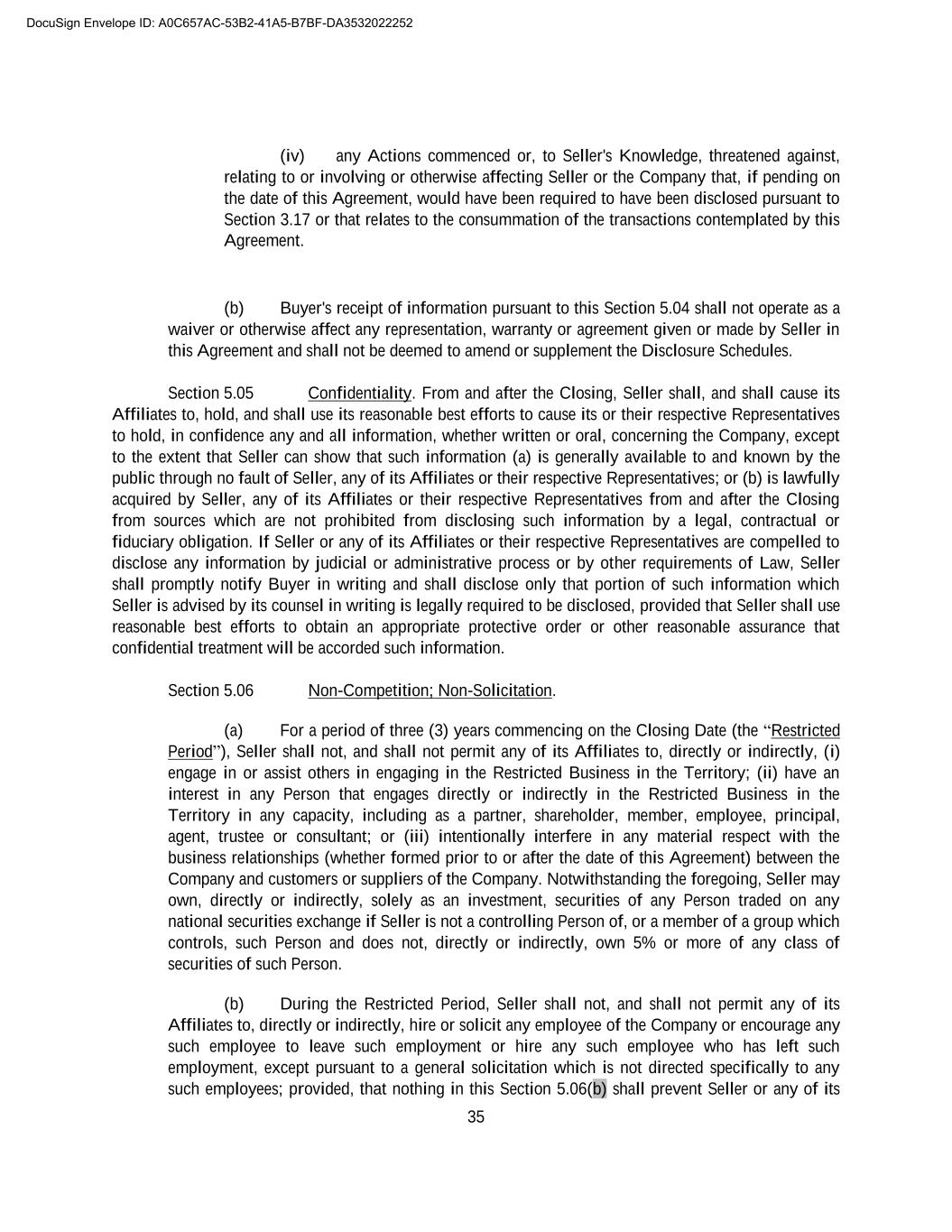 35 (iv) any Actions commenced or, to Seller's Knowledge, threatened against, relating to or involving or otherwise affecting Seller or the Company that, if pending on the date of this Agreement, would have been required to have been disclosed pursuant to Section 3.17 or that relates to the consummation of the transactions contemplated by this Agreement. (b) Buyer's receipt of information pursuant to this Section 5.04 shall not operate as a waiver or otherwise affect any representation, warranty or agreement given or made by Seller in this Agreement and shall not be deemed to amend or supplement the Disclosure Schedules. Section 5.05 Confidentiality. From and after the Closing, Seller shall, and shall cause its Affiliates to, hold, and shall use its reasonable best efforts to cause its or their respective Representatives to hold, in confidence any and all information, whether written or oral, concerning the Company, except to the extent that Seller can show that such information (a) is generally available to and known by the public through no fault of Seller, any of its Affiliates or their respective Representatives; or (b) is lawfully acquired by Seller, any of its Affiliates or their respective Representatives from and after the Closing from sources which are not prohibited from disclosing such information by a legal, contractual or fiduciary obligation. If Seller or any of its Affiliates or their respective Representatives are compelled to disclose any information by judicial or administrative process or by other requirements of Law, Seller shall promptly notify Buyer in writing and shall disclose only that portion of such information which Seller is advised by its counsel in writing is legally required to be disclosed, provided that Seller shall use reasonable best efforts to obtain an appropriate protective order or other reasonable assurance that confidential treatment will be accorded such information. Section 5.06 Non-Competition; Non-Solicitation. (a) For a period of three (3) years commencing on the Closing Date (the “Restricted Period”), Seller shall not, and shall not permit any of its Affiliates to, directly or indirectly, (i) engage in or assist others in engaging in the Restricted Business in the Territory; (ii) have an interest in any Person that engages directly or indirectly in the Restricted Business in the Territory in any capacity, including as a partner, shareholder, member, employee, principal, agent, trustee or consultant; or (iii) intentionally interfere in any material respect with the business relationships (whether formed prior to or after the date of this Agreement) between the Company and customers or suppliers of the Company. Notwithstanding the foregoing, Seller may own, directly or indirectly, solely as an investment, securities of any Person traded on any national securities exchange if Seller is not a controlling Person of, or a member of a group which controls, such Person and does not, directly or indirectly, own 5% or more of any class of securities of such Person. (b) During the Restricted Period, Seller shall not, and shall not permit any of its Affiliates to, directly or indirectly, hire or solicit any employee of the Company or encourage any such employee to leave such employment or hire any such employee who has left such employment, except pursuant to a general solicitation which is not directed specifically to any such employees; provided, that nothing in this Section 5.06(b) shall prevent Seller or any of its DocuSign Envelope ID: A0C657AC-53B2-41A5-B7BF-DA3532022252