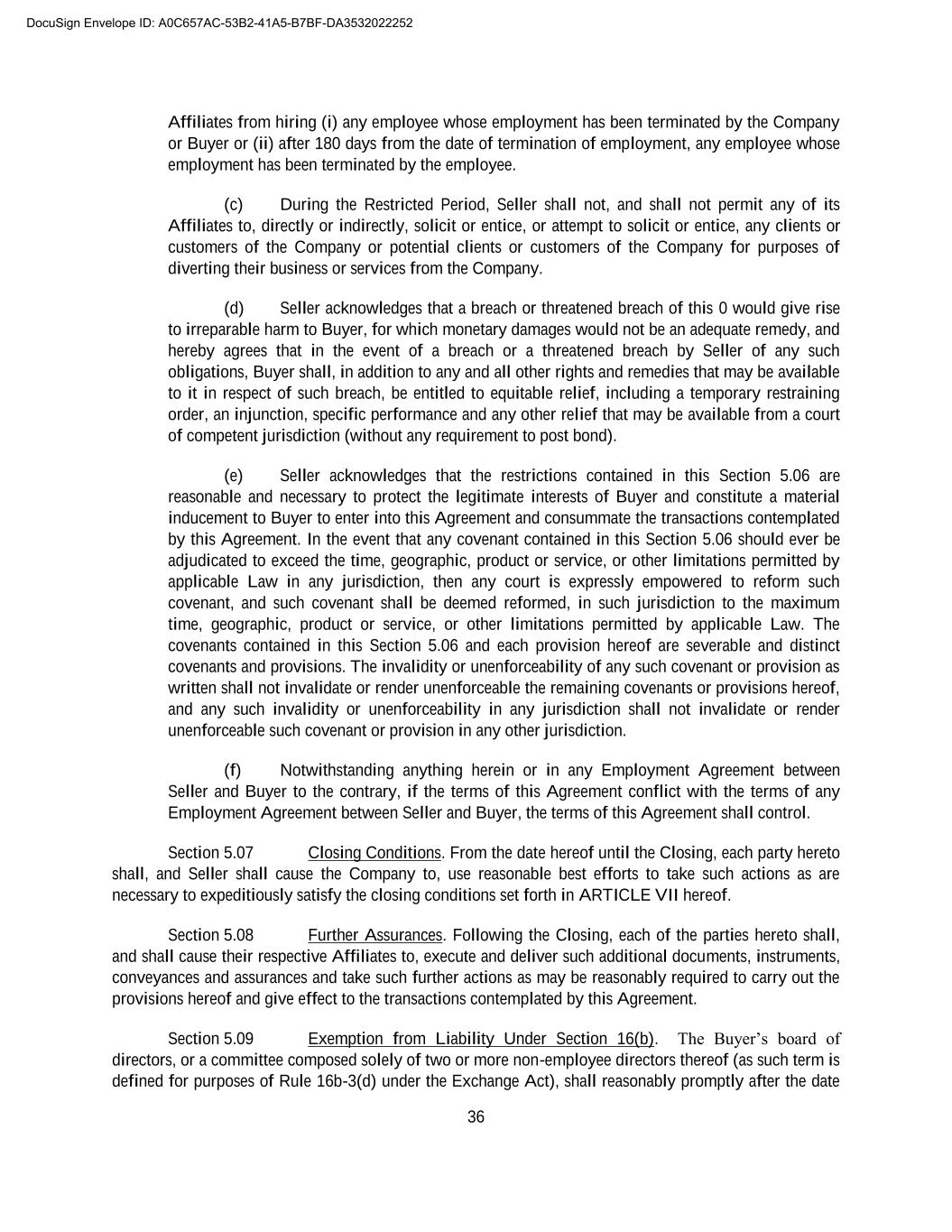 36 Affiliates from hiring (i) any employee whose employment has been terminated by the Company or Buyer or (ii) after 180 days from the date of termination of employment, any employee whose employment has been terminated by the employee. (c) During the Restricted Period, Seller shall not, and shall not permit any of its Affiliates to, directly or indirectly, solicit or entice, or attempt to solicit or entice, any clients or customers of the Company or potential clients or customers of the Company for purposes of diverting their business or services from the Company. (d) Seller acknowledges that a breach or threatened breach of this 0 would give rise to irreparable harm to Buyer, for which monetary damages would not be an adequate remedy, and hereby agrees that in the event of a breach or a threatened breach by Seller of any such obligations, Buyer shall, in addition to any and all other rights and remedies that may be available to it in respect of such breach, be entitled to equitable relief, including a temporary restraining order, an injunction, specific performance and any other relief that may be available from a court of competent jurisdiction (without any requirement to post bond). (e) Seller acknowledges that the restrictions contained in this Section 5.06 are reasonable and necessary to protect the legitimate interests of Buyer and constitute a material inducement to Buyer to enter into this Agreement and consummate the transactions contemplated by this Agreement. In the event that any covenant contained in this Section 5.06 should ever be adjudicated to exceed the time, geographic, product or service, or other limitations permitted by applicable Law in any jurisdiction, then any court is expressly empowered to reform such covenant, and such covenant shall be deemed reformed, in such jurisdiction to the maximum time, geographic, product or service, or other limitations permitted by applicable Law. The covenants contained in this Section 5.06 and each provision hereof are severable and distinct covenants and provisions. The invalidity or unenforceability of any such covenant or provision as written shall not invalidate or render unenforceable the remaining covenants or provisions hereof, and any such invalidity or unenforceability in any jurisdiction shall not invalidate or render unenforceable such covenant or provision in any other jurisdiction. (f) Notwithstanding anything herein or in any Employment Agreement between Seller and Buyer to the contrary, if the terms of this Agreement conflict with the terms of any Employment Agreement between Seller and Buyer, the terms of this Agreement shall control. Section 5.07 Closing Conditions. From the date hereof until the Closing, each party hereto shall, and Seller shall cause the Company to, use reasonable best efforts to take such actions as are necessary to expeditiously satisfy the closing conditions set forth in ARTICLE VII hereof. Section 5.08 Further Assurances. Following the Closing, each of the parties hereto shall, and shall cause their respective Affiliates to, execute and deliver such additional documents, instruments, conveyances and assurances and take such further actions as may be reasonably required to carry out the provisions hereof and give effect to the transactions contemplated by this Agreement. Section 5.09 Exemption from Liability Under Section 16(b). The Buyer’s board of directors, or a committee composed solely of two or more non-employee directors thereof (as such term is defined for purposes of Rule 16b-3(d) under the Exchange Act), shall reasonably promptly after the date DocuSign Envelope ID: A0C657AC-53B2-41A5-B7BF-DA3532022252