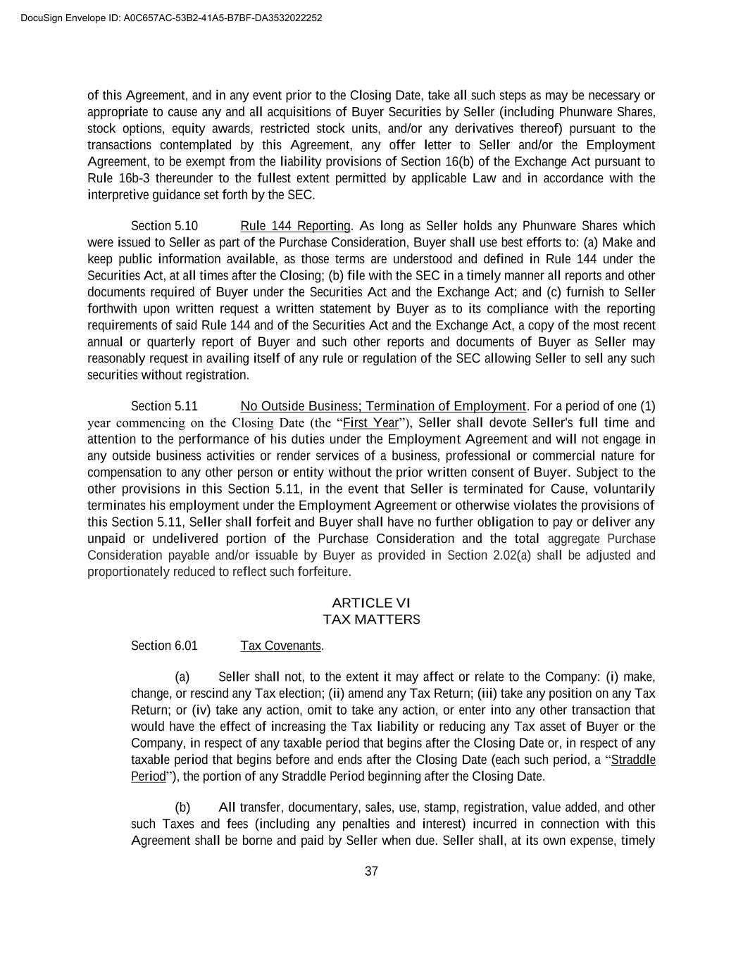 37 of this Agreement, and in any event prior to the Closing Date, take all such steps as may be necessary or appropriate to cause any and all acquisitions of Buyer Securities by Seller (including Phunware Shares, stock options, equity awards, restricted stock units, and/or any derivatives thereof) pursuant to the transactions contemplated by this Agreement, any offer letter to Seller and/or the Employment Agreement, to be exempt from the liability provisions of Section 16(b) of the Exchange Act pursuant to Rule 16b-3 thereunder to the fullest extent permitted by applicable Law and in accordance with the interpretive guidance set forth by the SEC. Section 5.10 Rule 144 Reporting. As long as Seller holds any Phunware Shares which were issued to Seller as part of the Purchase Consideration, Buyer shall use best efforts to: (a) Make and keep public information available, as those terms are understood and defined in Rule 144 under the Securities Act, at all times after the Closing; (b) file with the SEC in a timely manner all reports and other documents required of Buyer under the Securities Act and the Exchange Act; and (c) furnish to Seller forthwith upon written request a written statement by Buyer as to its compliance with the reporting requirements of said Rule 144 and of the Securities Act and the Exchange Act, a copy of the most recent annual or quarterly report of Buyer and such other reports and documents of Buyer as Seller may reasonably request in availing itself of any rule or regulation of the SEC allowing Seller to sell any such securities without registration. Section 5.11 No Outside Business; Termination of Employment. For a period of one (1) year commencing on the Closing Date (the “First Year”), Seller shall devote Seller's full time and attention to the performance of his duties under the Employment Agreement and will not engage in any outside business activities or render services of a business, professional or commercial nature for compensation to any other person or entity without the prior written consent of Buyer. Subject to the other provisions in this Section 5.11, in the event that Seller is terminated for Cause, voluntarily terminates his employment under the Employment Agreement or otherwise violates the provisions of this Section 5.11, Seller shall forfeit and Buyer shall have no further obligation to pay or deliver any unpaid or undelivered portion of the Purchase Consideration and the total aggregate Purchase Consideration payable and/or issuable by Buyer as provided in Section 2.02(a) shall be adjusted and proportionately reduced to reflect such forfeiture. ARTICLE VI TAX MATTERS Section 6.01 Tax Covenants. (a) Seller shall not, to the extent it may affect or relate to the Company: (i) make, change, or rescind any Tax election; (ii) amend any Tax Return; (iii) take any position on any Tax Return; or (iv) take any action, omit to take any action, or enter into any other transaction that would have the effect of increasing the Tax liability or reducing any Tax asset of Buyer or the Company, in respect of any taxable period that begins after the Closing Date or, in respect of any taxable period that begins before and ends after the Closing Date (each such period, a “Straddle Period”), the portion of any Straddle Period beginning after the Closing Date. (b) All transfer, documentary, sales, use, stamp, registration, value added, and other such Taxes and fees (including any penalties and interest) incurred in connection with this Agreement shall be borne and paid by Seller when due. Seller shall, at its own expense, timely DocuSign Envelope ID: A0C657AC-53B2-41A5-B7BF-DA3532022252