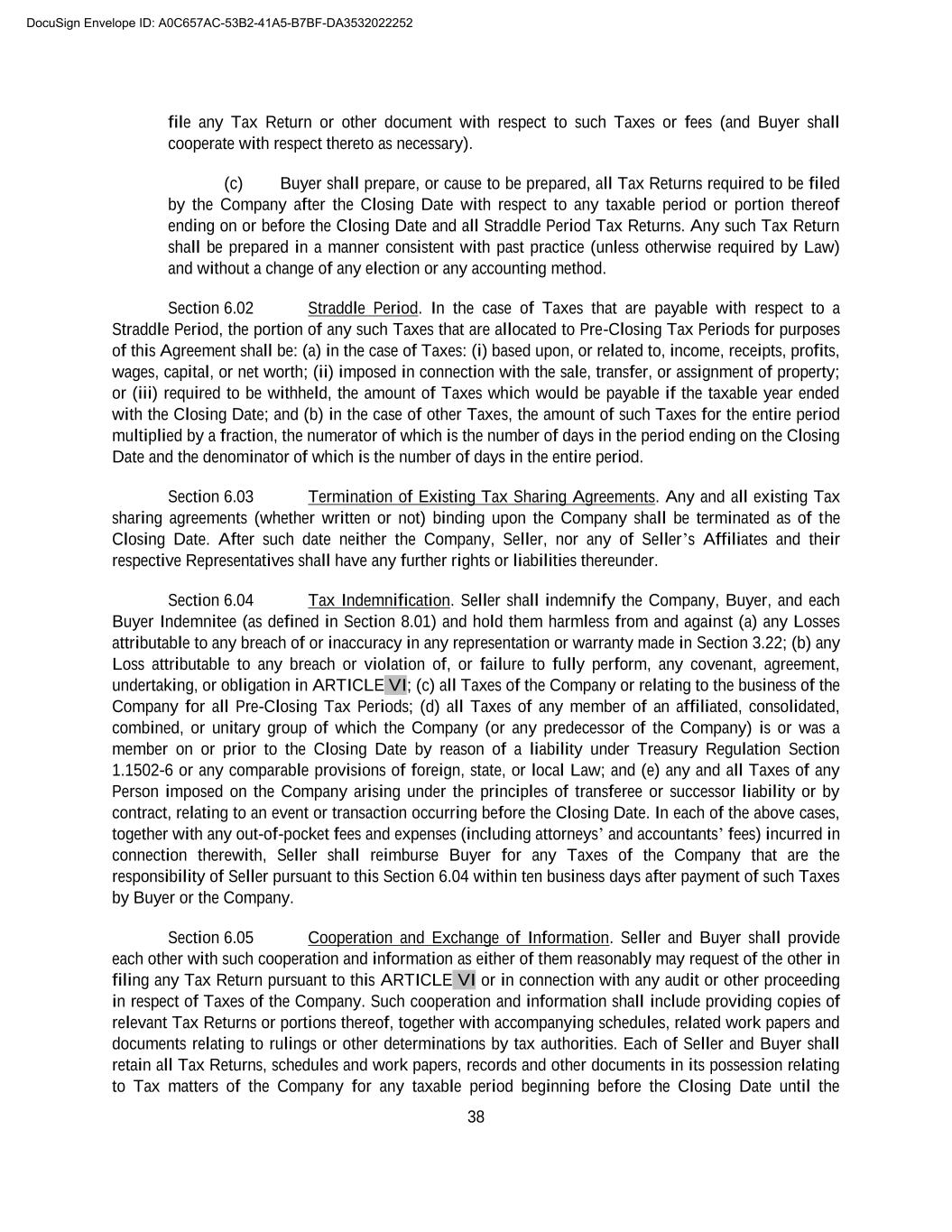 38 file any Tax Return or other document with respect to such Taxes or fees (and Buyer shall cooperate with respect thereto as necessary). (c) Buyer shall prepare, or cause to be prepared, all Tax Returns required to be filed by the Company after the Closing Date with respect to any taxable period or portion thereof ending on or before the Closing Date and all Straddle Period Tax Returns. Any such Tax Return shall be prepared in a manner consistent with past practice (unless otherwise required by Law) and without a change of any election or any accounting method. Section 6.02 Straddle Period. In the case of Taxes that are payable with respect to a Straddle Period, the portion of any such Taxes that are allocated to Pre-Closing Tax Periods for purposes of this Agreement shall be: (a) in the case of Taxes: (i) based upon, or related to, income, receipts, profits, wages, capital, or net worth; (ii) imposed in connection with the sale, transfer, or assignment of property; or (iii) required to be withheld, the amount of Taxes which would be payable if the taxable year ended with the Closing Date; and (b) in the case of other Taxes, the amount of such Taxes for the entire period multiplied by a fraction, the numerator of which is the number of days in the period ending on the Closing Date and the denominator of which is the number of days in the entire period. Section 6.03 Termination of Existing Tax Sharing Agreements. Any and all existing Tax sharing agreements (whether written or not) binding upon the Company shall be terminated as of the Closing Date. After such date neither the Company, Seller, nor any of Seller’s Affiliates and their respective Representatives shall have any further rights or liabilities thereunder. Section 6.04 Tax Indemnification. Seller shall indemnify the Company, Buyer, and each Buyer Indemnitee (as defined in Section 8.01) and hold them harmless from and against (a) any Losses attributable to any breach of or inaccuracy in any representation or warranty made in Section 3.22; (b) any Loss attributable to any breach or violation of, or failure to fully perform, any covenant, agreement, undertaking, or obligation in ARTICLE VI; (c) all Taxes of the Company or relating to the business of the Company for all Pre-Closing Tax Periods; (d) all Taxes of any member of an affiliated, consolidated, combined, or unitary group of which the Company (or any predecessor of the Company) is or was a member on or prior to the Closing Date by reason of a liability under Treasury Regulation Section 1.1502-6 or any comparable provisions of foreign, state, or local Law; and (e) any and all Taxes of any Person imposed on the Company arising under the principles of transferee or successor liability or by contract, relating to an event or transaction occurring before the Closing Date. In each of the above cases, together with any out-of-pocket fees and expenses (including attorneys’ and accountants’ fees) incurred in connection therewith, Seller shall reimburse Buyer for any Taxes of the Company that are the responsibility of Seller pursuant to this Section 6.04 within ten business days after payment of such Taxes by Buyer or the Company. Section 6.05 Cooperation and Exchange of Information. Seller and Buyer shall provide each other with such cooperation and information as either of them reasonably may request of the other in filing any Tax Return pursuant to this ARTICLE VI or in connection with any audit or other proceeding in respect of Taxes of the Company. Such cooperation and information shall include providing copies of relevant Tax Returns or portions thereof, together with accompanying schedules, related work papers and documents relating to rulings or other determinations by tax authorities. Each of Seller and Buyer shall retain all Tax Returns, schedules and work papers, records and other documents in its possession relating to Tax matters of the Company for any taxable period beginning before the Closing Date until the DocuSign Envelope ID: A0C657AC-53B2-41A5-B7BF-DA3532022252