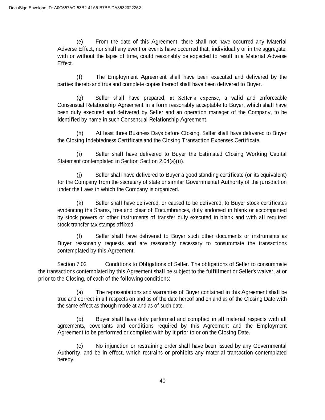 40 (e) From the date of this Agreement, there shall not have occurred any Material Adverse Effect, nor shall any event or events have occurred that, individually or in the aggregate, with or without the lapse of time, could reasonably be expected to result in a Material Adverse Effect. (f) The Employment Agreement shall have been executed and delivered by the parties thereto and true and complete copies thereof shall have been delivered to Buyer. (g) Seller shall have prepared, at Seller’s expense, a valid and enforceable Consensual Relationship Agreement in a form reasonably acceptable to Buyer, which shall have been duly executed and delivered by Seller and an operation manager of the Company, to be identified by name in such Consensual Relationship Agreement. (h) At least three Business Days before Closing, Seller shall have delivered to Buyer the Closing Indebtedness Certificate and the Closing Transaction Expenses Certificate. (i) Seller shall have delivered to Buyer the Estimated Closing Working Capital Statement contemplated in Section Section 2.04(a)(ii). (j) Seller shall have delivered to Buyer a good standing certificate (or its equivalent) for the Company from the secretary of state or similar Governmental Authority of the jurisdiction under the Laws in which the Company is organized. (k) Seller shall have delivered, or caused to be delivered, to Buyer stock certificates evidencing the Shares, free and clear of Encumbrances, duly endorsed in blank or accompanied by stock powers or other instruments of transfer duly executed in blank and with all required stock transfer tax stamps affixed. (l) Seller shall have delivered to Buyer such other documents or instruments as Buyer reasonably requests and are reasonably necessary to consummate the transactions contemplated by this Agreement. Section 7.02 Conditions to Obligations of Seller. The obligations of Seller to consummate the transactions contemplated by this Agreement shall be subject to the fulfillment or Seller's waiver, at or prior to the Closing, of each of the following conditions: (a) The representations and warranties of Buyer contained in this Agreement shall be true and correct in all respects on and as of the date hereof and on and as of the Closing Date with the same effect as though made at and as of such date. (b) Buyer shall have duly performed and complied in all material respects with all agreements, covenants and conditions required by this Agreement and the Employment Agreement to be performed or complied with by it prior to or on the Closing Date. (c) No injunction or restraining order shall have been issued by any Governmental Authority, and be in effect, which restrains or prohibits any material transaction contemplated hereby. DocuSign Envelope ID: A0C657AC-53B2-41A5-B7BF-DA3532022252