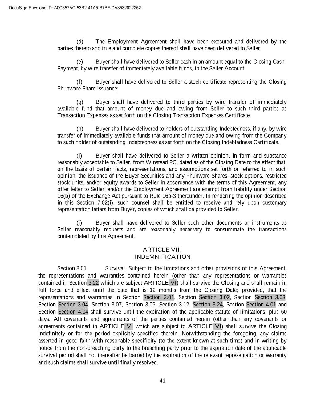 41 (d) The Employment Agreement shall have been executed and delivered by the parties thereto and true and complete copies thereof shall have been delivered to Seller. (e) Buyer shall have delivered to Seller cash in an amount equal to the Closing Cash Payment, by wire transfer of immediately available funds, to the Seller Account. (f) Buyer shall have delivered to Seller a stock certificate representing the Closing Phunware Share Issuance; (g) Buyer shall have delivered to third parties by wire transfer of immediately available fund that amount of money due and owing from Seller to such third parties as Transaction Expenses as set forth on the Closing Transaction Expenses Certificate. (h) Buyer shall have delivered to holders of outstanding Indebtedness, if any, by wire transfer of immediately available funds that amount of money due and owing from the Company to such holder of outstanding Indebtedness as set forth on the Closing Indebtedness Certificate. (i) Buyer shall have delivered to Seller a written opinion, in form and substance reasonably acceptable to Seller, from Winstead PC, dated as of the Closing Date to the effect that, on the basis of certain facts, representations, and assumptions set forth or referred to in such opinion, the issuance of the Buyer Securities and any Phunware Shares, stock options, restricted stock units, and/or equity awards to Seller in accordance with the terms of this Agreement, any offer letter to Seller, and/or the Employment Agreement are exempt from liability under Section 16(b) of the Exchange Act pursuant to Rule 16b-3 thereunder. In rendering the opinion described in this Section 7.02(i), such counsel shall be entitled to receive and rely upon customary representation letters from Buyer, copies of which shall be provided to Seller. (j) Buyer shall have delivered to Seller such other documents or instruments as Seller reasonably requests and are reasonably necessary to consummate the transactions contemplated by this Agreement. ARTICLE VIII INDEMNIFICATION Section 8.01 Survival. Subject to the limitations and other provisions of this Agreement, the representations and warranties contained herein (other than any representations or warranties contained in Section 3.22 which are subject ARTICLE VI) shall survive the Closing and shall remain in full force and effect until the date that is 12 months from the Closing Date; provided, that the representations and warranties in Section Section 3.01, Section Section 3.02, Section Section 3.03, Section Section 3.04, Section 3.07, Section 3.09, Section 3.12, Section 3.24, Section Section 4.01 and Section Section 4.04 shall survive until the expiration of the applicable statute of limitations, plus 60 days. All covenants and agreements of the parties contained herein (other than any covenants or agreements contained in ARTICLE VI which are subject to ARTICLE VI) shall survive the Closing indefinitely or for the period explicitly specified therein. Notwithstanding the foregoing, any claims asserted in good faith with reasonable specificity (to the extent known at such time) and in writing by notice from the non-breaching party to the breaching party prior to the expiration date of the applicable survival period shall not thereafter be barred by the expiration of the relevant representation or warranty and such claims shall survive until finally resolved. DocuSign Envelope ID: A0C657AC-53B2-41A5-B7BF-DA3532022252