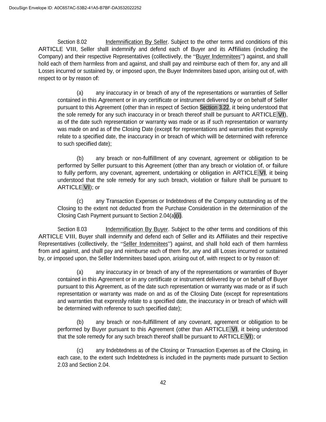 42 Section 8.02 Indemnification By Seller. Subject to the other terms and conditions of this ARTICLE VIII, Seller shall indemnify and defend each of Buyer and its Affiliates (including the Company) and their respective Representatives (collectively, the “Buyer Indemnitees”) against, and shall hold each of them harmless from and against, and shall pay and reimburse each of them for, any and all Losses incurred or sustained by, or imposed upon, the Buyer Indemnitees based upon, arising out of, with respect to or by reason of: (a) any inaccuracy in or breach of any of the representations or warranties of Seller contained in this Agreement or in any certificate or instrument delivered by or on behalf of Seller pursuant to this Agreement (other than in respect of Section Section 3.22, it being understood that the sole remedy for any such inaccuracy in or breach thereof shall be pursuant to ARTICLE VI), as of the date such representation or warranty was made or as if such representation or warranty was made on and as of the Closing Date (except for representations and warranties that expressly relate to a specified date, the inaccuracy in or breach of which will be determined with reference to such specified date); (b) any breach or non-fulfillment of any covenant, agreement or obligation to be performed by Seller pursuant to this Agreement (other than any breach or violation of, or failure to fully perform, any covenant, agreement, undertaking or obligation in ARTICLE VI, it being understood that the sole remedy for any such breach, violation or failure shall be pursuant to ARTICLE VI); or (c) any Transaction Expenses or Indebtedness of the Company outstanding as of the Closing to the extent not deducted from the Purchase Consideration in the determination of the Closing Cash Payment pursuant to Section 2.04(a)(i). Section 8.03 Indemnification By Buyer. Subject to the other terms and conditions of this ARTICLE VIII, Buyer shall indemnify and defend each of Seller and its Affiliates and their respective Representatives (collectively, the “Seller Indemnitees”) against, and shall hold each of them harmless from and against, and shall pay and reimburse each of them for, any and all Losses incurred or sustained by, or imposed upon, the Seller Indemnitees based upon, arising out of, with respect to or by reason of: (a) any inaccuracy in or breach of any of the representations or warranties of Buyer contained in this Agreement or in any certificate or instrument delivered by or on behalf of Buyer pursuant to this Agreement, as of the date such representation or warranty was made or as if such representation or warranty was made on and as of the Closing Date (except for representations and warranties that expressly relate to a specified date, the inaccuracy in or breach of which will be determined with reference to such specified date); (b) any breach or non-fulfillment of any covenant, agreement or obligation to be performed by Buyer pursuant to this Agreement (other than ARTICLE VI, it being understood that the sole remedy for any such breach thereof shall be pursuant to ARTICLE VI); or (c) any Indebtedness as of the Closing or Transaction Expenses as of the Closing, in each case, to the extent such Indebtedness is included in the payments made pursuant to Section 2.03 and Section 2.04. DocuSign Envelope ID: A0C657AC-53B2-41A5-B7BF-DA3532022252