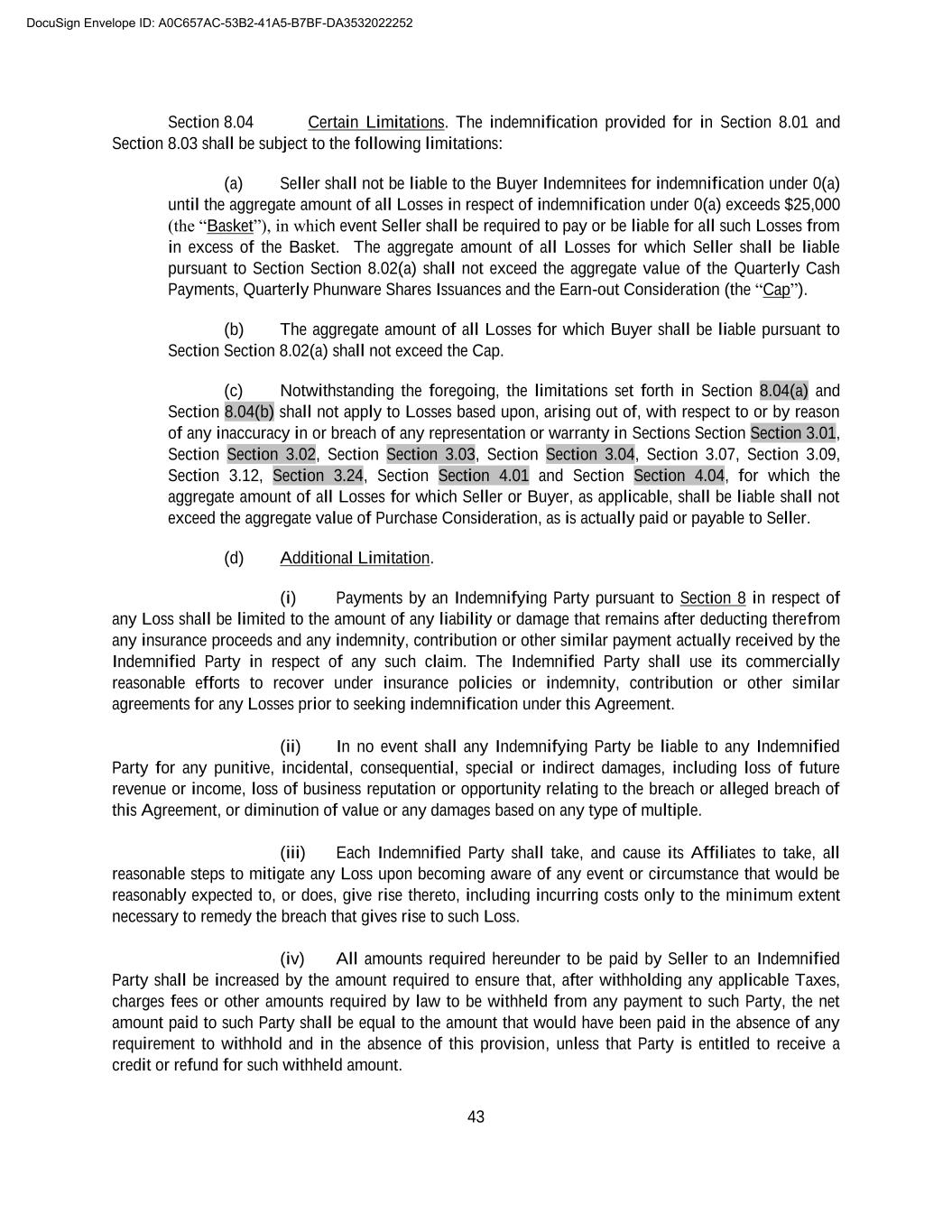 43 Section 8.04 Certain Limitations. The indemnification provided for in Section 8.01 and Section 8.03 shall be subject to the following limitations: (a) Seller shall not be liable to the Buyer Indemnitees for indemnification under 0(a) until the aggregate amount of all Losses in respect of indemnification under 0(a) exceeds $25,000 (the “Basket”), in which event Seller shall be required to pay or be liable for all such Losses from in excess of the Basket. The aggregate amount of all Losses for which Seller shall be liable pursuant to Section Section 8.02(a) shall not exceed the aggregate value of the Quarterly Cash Payments, Quarterly Phunware Shares Issuances and the Earn-out Consideration (the “Cap”). (b) The aggregate amount of all Losses for which Buyer shall be liable pursuant to Section Section 8.02(a) shall not exceed the Cap. (c) Notwithstanding the foregoing, the limitations set forth in Section 8.04(a) and Section 8.04(b) shall not apply to Losses based upon, arising out of, with respect to or by reason of any inaccuracy in or breach of any representation or warranty in Sections Section Section 3.01, Section Section 3.02, Section Section 3.03, Section Section 3.04, Section 3.07, Section 3.09, Section 3.12, Section 3.24, Section Section 4.01 and Section Section 4.04, for which the aggregate amount of all Losses for which Seller or Buyer, as applicable, shall be liable shall not exceed the aggregate value of Purchase Consideration, as is actually paid or payable to Seller. (d) Additional Limitation. (i) Payments by an Indemnifying Party pursuant to Section 8 in respect of any Loss shall be limited to the amount of any liability or damage that remains after deducting therefrom any insurance proceeds and any indemnity, contribution or other similar payment actually received by the Indemnified Party in respect of any such claim. The Indemnified Party shall use its commercially reasonable efforts to recover under insurance policies or indemnity, contribution or other similar agreements for any Losses prior to seeking indemnification under this Agreement. (ii) In no event shall any Indemnifying Party be liable to any Indemnified Party for any punitive, incidental, consequential, special or indirect damages, including loss of future revenue or income, loss of business reputation or opportunity relating to the breach or alleged breach of this Agreement, or diminution of value or any damages based on any type of multiple. (iii) Each Indemnified Party shall take, and cause its Affiliates to take, all reasonable steps to mitigate any Loss upon becoming aware of any event or circumstance that would be reasonably expected to, or does, give rise thereto, including incurring costs only to the minimum extent necessary to remedy the breach that gives rise to such Loss. (iv) All amounts required hereunder to be paid by Seller to an Indemnified Party shall be increased by the amount required to ensure that, after withholding any applicable Taxes, charges fees or other amounts required by law to be withheld from any payment to such Party, the net amount paid to such Party shall be equal to the amount that would have been paid in the absence of any requirement to withhold and in the absence of this provision, unless that Party is entitled to receive a credit or refund for such withheld amount. DocuSign Envelope ID: A0C657AC-53B2-41A5-B7BF-DA3532022252