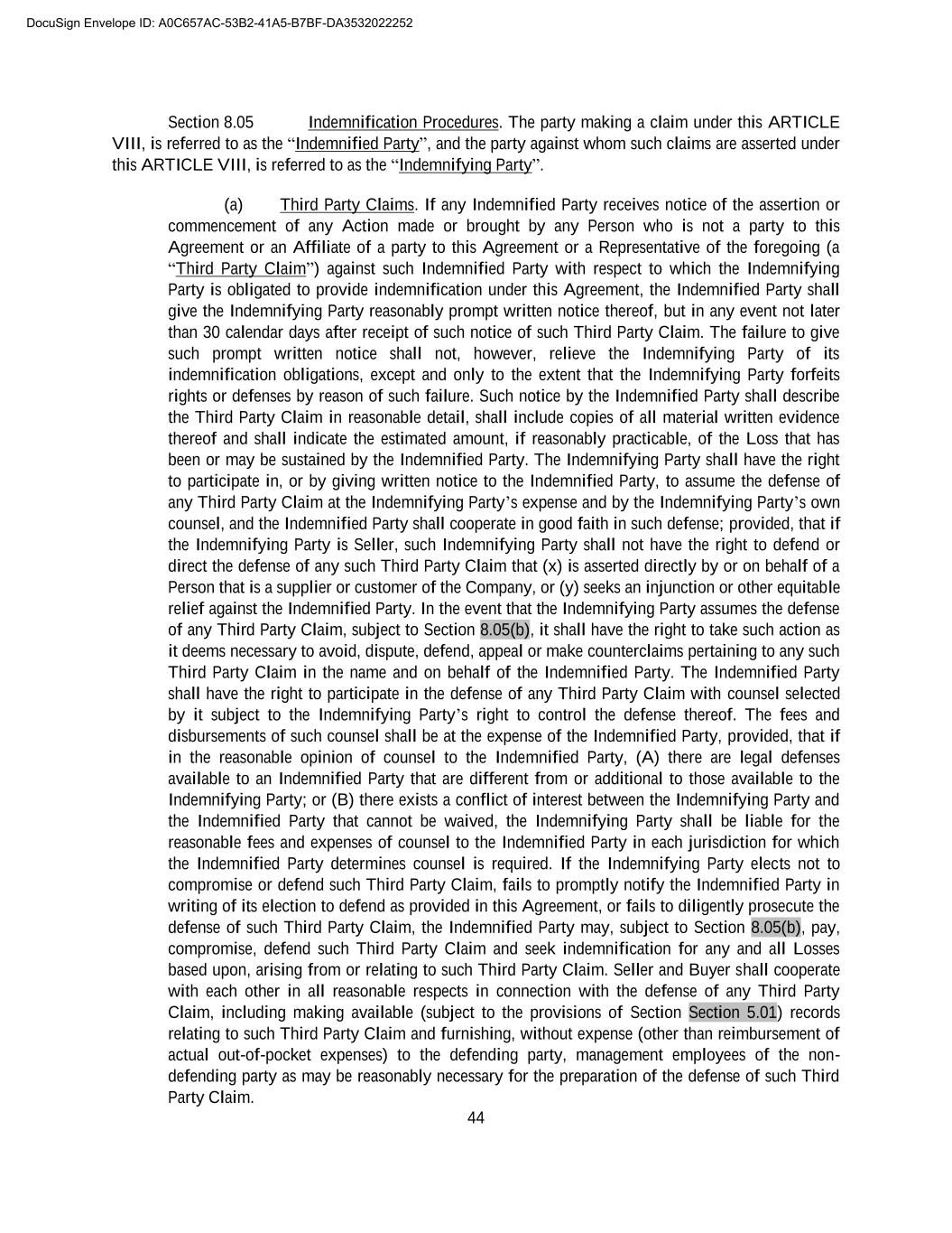 44 Section 8.05 Indemnification Procedures. The party making a claim under this ARTICLE VIII, is referred to as the “Indemnified Party”, and the party against whom such claims are asserted under this ARTICLE VIII, is referred to as the “Indemnifying Party”. (a) Third Party Claims. If any Indemnified Party receives notice of the assertion or commencement of any Action made or brought by any Person who is not a party to this Agreement or an Affiliate of a party to this Agreement or a Representative of the foregoing (a “Third Party Claim”) against such Indemnified Party with respect to which the Indemnifying Party is obligated to provide indemnification under this Agreement, the Indemnified Party shall give the Indemnifying Party reasonably prompt written notice thereof, but in any event not later than 30 calendar days after receipt of such notice of such Third Party Claim. The failure to give such prompt written notice shall not, however, relieve the Indemnifying Party of its indemnification obligations, except and only to the extent that the Indemnifying Party forfeits rights or defenses by reason of such failure. Such notice by the Indemnified Party shall describe the Third Party Claim in reasonable detail, shall include copies of all material written evidence thereof and shall indicate the estimated amount, if reasonably practicable, of the Loss that has been or may be sustained by the Indemnified Party. The Indemnifying Party shall have the right to participate in, or by giving written notice to the Indemnified Party, to assume the defense of any Third Party Claim at the Indemnifying Party’s expense and by the Indemnifying Party’s own counsel, and the Indemnified Party shall cooperate in good faith in such defense; provided, that if the Indemnifying Party is Seller, such Indemnifying Party shall not have the right to defend or direct the defense of any such Third Party Claim that (x) is asserted directly by or on behalf of a Person that is a supplier or customer of the Company, or (y) seeks an injunction or other equitable relief against the Indemnified Party. In the event that the Indemnifying Party assumes the defense of any Third Party Claim, subject to Section 8.05(b), it shall have the right to take such action as it deems necessary to avoid, dispute, defend, appeal or make counterclaims pertaining to any such Third Party Claim in the name and on behalf of the Indemnified Party. The Indemnified Party shall have the right to participate in the defense of any Third Party Claim with counsel selected by it subject to the Indemnifying Party’s right to control the defense thereof. The fees and disbursements of such counsel shall be at the expense of the Indemnified Party, provided, that if in the reasonable opinion of counsel to the Indemnified Party, (A) there are legal defenses available to an Indemnified Party that are different from or additional to those available to the Indemnifying Party; or (B) there exists a conflict of interest between the Indemnifying Party and the Indemnified Party that cannot be waived, the Indemnifying Party shall be liable for the reasonable fees and expenses of counsel to the Indemnified Party in each jurisdiction for which the Indemnified Party determines counsel is required. If the Indemnifying Party elects not to compromise or defend such Third Party Claim, fails to promptly notify the Indemnified Party in writing of its election to defend as provided in this Agreement, or fails to diligently prosecute the defense of such Third Party Claim, the Indemnified Party may, subject to Section 8.05(b), pay, compromise, defend such Third Party Claim and seek indemnification for any and all Losses based upon, arising from or relating to such Third Party Claim. Seller and Buyer shall cooperate with each other in all reasonable respects in connection with the defense of any Third Party Claim, including making available (subject to the provisions of Section Section 5.01) records relating to such Third Party Claim and furnishing, without expense (other than reimbursement of actual out-of-pocket expenses) to the defending party, management employees of the non- defending party as may be reasonably necessary for the preparation of the defense of such Third Party Claim. DocuSign Envelope ID: A0C657AC-53B2-41A5-B7BF-DA3532022252