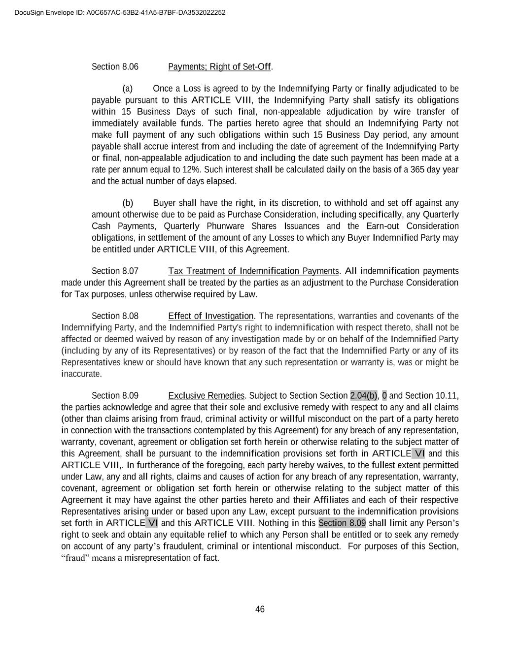 46 Section 8.06 Payments; Right of Set-Off. (a) Once a Loss is agreed to by the Indemnifying Party or finally adjudicated to be payable pursuant to this ARTICLE VIII, the Indemnifying Party shall satisfy its obligations within 15 Business Days of such final, non-appealable adjudication by wire transfer of immediately available funds. The parties hereto agree that should an Indemnifying Party not make full payment of any such obligations within such 15 Business Day period, any amount payable shall accrue interest from and including the date of agreement of the Indemnifying Party or final, non-appealable adjudication to and including the date such payment has been made at a rate per annum equal to 12%. Such interest shall be calculated daily on the basis of a 365 day year and the actual number of days elapsed. (b) Buyer shall have the right, in its discretion, to withhold and set off against any amount otherwise due to be paid as Purchase Consideration, including specifically, any Quarterly Cash Payments, Quarterly Phunware Shares Issuances and the Earn-out Consideration obligations, in settlement of the amount of any Losses to which any Buyer Indemnified Party may be entitled under ARTICLE VIII, of this Agreement. Section 8.07 Tax Treatment of Indemnification Payments. All indemnification payments made under this Agreement shall be treated by the parties as an adjustment to the Purchase Consideration for Tax purposes, unless otherwise required by Law. Section 8.08 Effect of Investigation. The representations, warranties and covenants of the Indemnifying Party, and the Indemnified Party's right to indemnification with respect thereto, shall not be affected or deemed waived by reason of any investigation made by or on behalf of the Indemnified Party (including by any of its Representatives) or by reason of the fact that the Indemnified Party or any of its Representatives knew or should have known that any such representation or warranty is, was or might be inaccurate. Section 8.09 Exclusive Remedies. Subject to Section Section 2.04(b), 0 and Section 10.11, the parties acknowledge and agree that their sole and exclusive remedy with respect to any and all claims (other than claims arising from fraud, criminal activity or willful misconduct on the part of a party hereto in connection with the transactions contemplated by this Agreement) for any breach of any representation, warranty, covenant, agreement or obligation set forth herein or otherwise relating to the subject matter of this Agreement, shall be pursuant to the indemnification provisions set forth in ARTICLE VI and this ARTICLE VIII,. In furtherance of the foregoing, each party hereby waives, to the fullest extent permitted under Law, any and all rights, claims and causes of action for any breach of any representation, warranty, covenant, agreement or obligation set forth herein or otherwise relating to the subject matter of this Agreement it may have against the other parties hereto and their Affiliates and each of their respective Representatives arising under or based upon any Law, except pursuant to the indemnification provisions set forth in ARTICLE VI and this ARTICLE VIII. Nothing in this Section 8.09 shall limit any Person’s right to seek and obtain any equitable relief to which any Person shall be entitled or to seek any remedy on account of any party’s fraudulent, criminal or intentional misconduct. For purposes of this Section, “fraud” means a misrepresentation of fact. DocuSign Envelope ID: A0C657AC-53B2-41A5-B7BF-DA3532022252