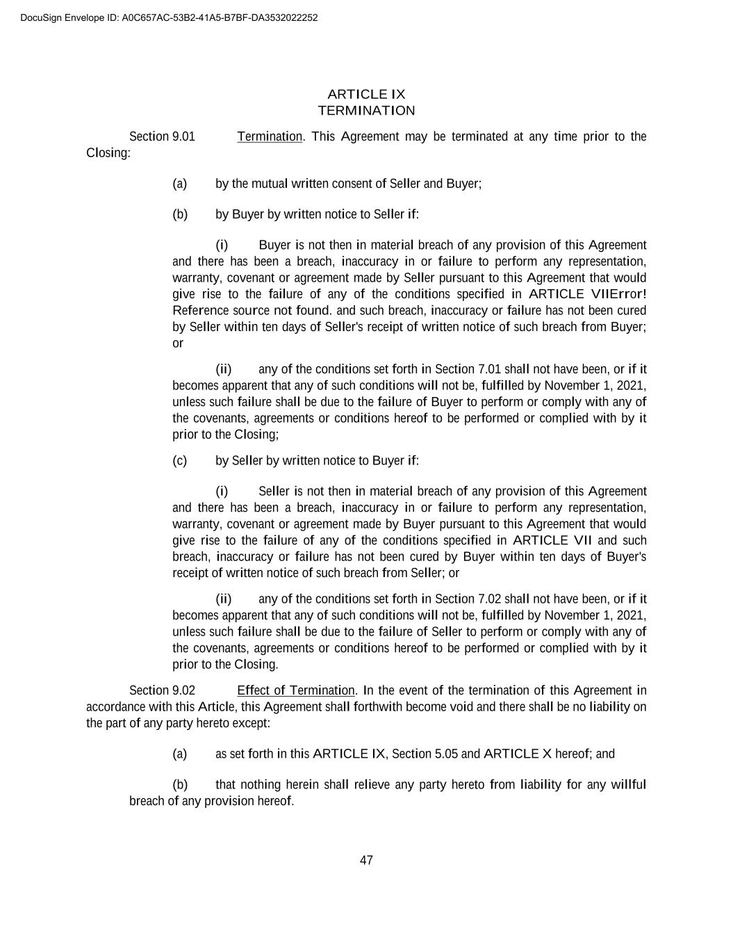 47 ARTICLE IX TERMINATION Section 9.01 Termination. This Agreement may be terminated at any time prior to the Closing: (a) by the mutual written consent of Seller and Buyer; (b) by Buyer by written notice to Seller if: (i) Buyer is not then in material breach of any provision of this Agreement and there has been a breach, inaccuracy in or failure to perform any representation, warranty, covenant or agreement made by Seller pursuant to this Agreement that would give rise to the failure of any of the conditions specified in ARTICLE VIIError! Reference source not found. and such breach, inaccuracy or failure has not been cured by Seller within ten days of Seller's receipt of written notice of such breach from Buyer; or (ii) any of the conditions set forth in Section 7.01 shall not have been, or if it becomes apparent that any of such conditions will not be, fulfilled by November 1, 2021, unless such failure shall be due to the failure of Buyer to perform or comply with any of the covenants, agreements or conditions hereof to be performed or complied with by it prior to the Closing; (c) by Seller by written notice to Buyer if: (i) Seller is not then in material breach of any provision of this Agreement and there has been a breach, inaccuracy in or failure to perform any representation, warranty, covenant or agreement made by Buyer pursuant to this Agreement that would give rise to the failure of any of the conditions specified in ARTICLE VII and such breach, inaccuracy or failure has not been cured by Buyer within ten days of Buyer's receipt of written notice of such breach from Seller; or (ii) any of the conditions set forth in Section 7.02 shall not have been, or if it becomes apparent that any of such conditions will not be, fulfilled by November 1, 2021, unless such failure shall be due to the failure of Seller to perform or comply with any of the covenants, agreements or conditions hereof to be performed or complied with by it prior to the Closing. Section 9.02 Effect of Termination. In the event of the termination of this Agreement in accordance with this Article, this Agreement shall forthwith become void and there shall be no liability on the part of any party hereto except: (a) as set forth in this ARTICLE IX, Section 5.05 and ARTICLE X hereof; and (b) that nothing herein shall relieve any party hereto from liability for any willful breach of any provision hereof. DocuSign Envelope ID: A0C657AC-53B2-41A5-B7BF-DA3532022252