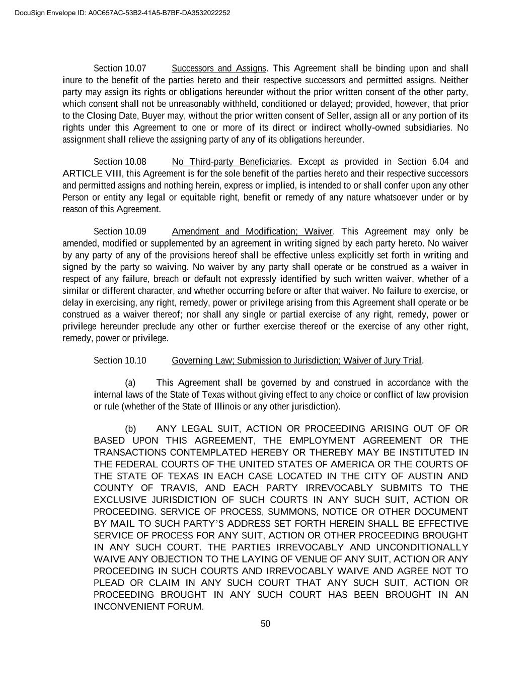 50 Section 10.07 Successors and Assigns. This Agreement shall be binding upon and shall inure to the benefit of the parties hereto and their respective successors and permitted assigns. Neither party may assign its rights or obligations hereunder without the prior written consent of the other party, which consent shall not be unreasonably withheld, conditioned or delayed; provided, however, that prior to the Closing Date, Buyer may, without the prior written consent of Seller, assign all or any portion of its rights under this Agreement to one or more of its direct or indirect wholly-owned subsidiaries. No assignment shall relieve the assigning party of any of its obligations hereunder. Section 10.08 No Third-party Beneficiaries. Except as provided in Section 6.04 and ARTICLE VIII, this Agreement is for the sole benefit of the parties hereto and their respective successors and permitted assigns and nothing herein, express or implied, is intended to or shall confer upon any other Person or entity any legal or equitable right, benefit or remedy of any nature whatsoever under or by reason of this Agreement. Section 10.09 Amendment and Modification; Waiver. This Agreement may only be amended, modified or supplemented by an agreement in writing signed by each party hereto. No waiver by any party of any of the provisions hereof shall be effective unless explicitly set forth in writing and signed by the party so waiving. No waiver by any party shall operate or be construed as a waiver in respect of any failure, breach or default not expressly identified by such written waiver, whether of a similar or different character, and whether occurring before or after that waiver. No failure to exercise, or delay in exercising, any right, remedy, power or privilege arising from this Agreement shall operate or be construed as a waiver thereof; nor shall any single or partial exercise of any right, remedy, power or privilege hereunder preclude any other or further exercise thereof or the exercise of any other right, remedy, power or privilege. Section 10.10 Governing Law; Submission to Jurisdiction; Waiver of Jury Trial. (a) This Agreement shall be governed by and construed in accordance with the internal laws of the State of Texas without giving effect to any choice or conflict of law provision or rule (whether of the State of Illinois or any other jurisdiction). (b) ANY LEGAL SUIT, ACTION OR PROCEEDING ARISING OUT OF OR BASED UPON THIS AGREEMENT, THE EMPLOYMENT AGREEMENT OR THE TRANSACTIONS CONTEMPLATED HEREBY OR THEREBY MAY BE INSTITUTED IN THE FEDERAL COURTS OF THE UNITED STATES OF AMERICA OR THE COURTS OF THE STATE OF TEXAS IN EACH CASE LOCATED IN THE CITY OF AUSTIN AND COUNTY OF TRAVIS, AND EACH PARTY IRREVOCABLY SUBMITS TO THE EXCLUSIVE JURISDICTION OF SUCH COURTS IN ANY SUCH SUIT, ACTION OR PROCEEDING. SERVICE OF PROCESS, SUMMONS, NOTICE OR OTHER DOCUMENT BY MAIL TO SUCH PARTY’S ADDRESS SET FORTH HEREIN SHALL BE EFFECTIVE SERVICE OF PROCESS FOR ANY SUIT, ACTION OR OTHER PROCEEDING BROUGHT IN ANY SUCH COURT. THE PARTIES IRREVOCABLY AND UNCONDITIONALLY WAIVE ANY OBJECTION TO THE LAYING OF VENUE OF ANY SUIT, ACTION OR ANY PROCEEDING IN SUCH COURTS AND IRREVOCABLY WAIVE AND AGREE NOT TO PLEAD OR CLAIM IN ANY SUCH COURT THAT ANY SUCH SUIT, ACTION OR PROCEEDING BROUGHT IN ANY SUCH COURT HAS BEEN BROUGHT IN AN INCONVENIENT FORUM. DocuSign Envelope ID: A0C657AC-53B2-41A5-B7BF-DA3532022252
