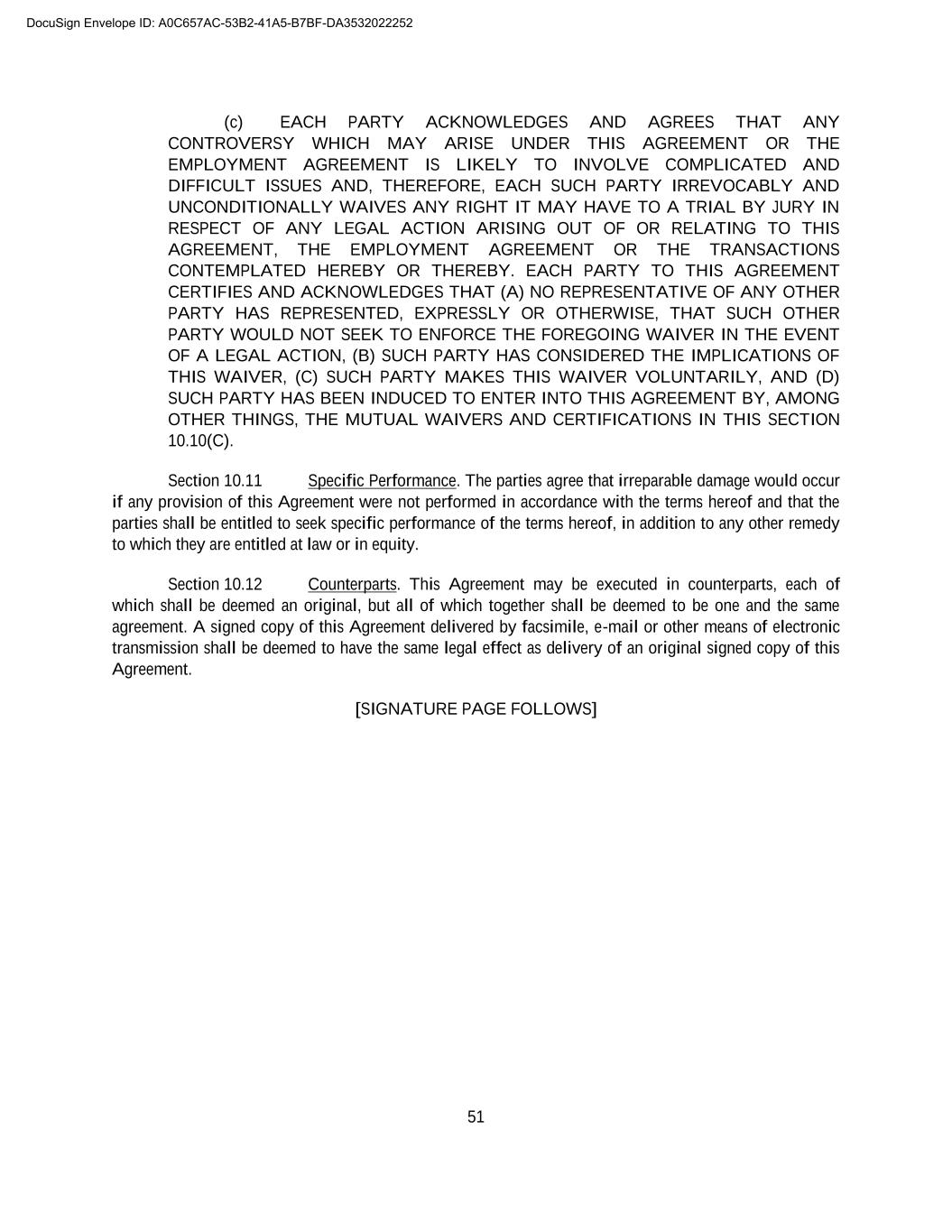 51 (c) EACH PARTY ACKNOWLEDGES AND AGREES THAT ANY CONTROVERSY WHICH MAY ARISE UNDER THIS AGREEMENT OR THE EMPLOYMENT AGREEMENT IS LIKELY TO INVOLVE COMPLICATED AND DIFFICULT ISSUES AND, THEREFORE, EACH SUCH PARTY IRREVOCABLY AND UNCONDITIONALLY WAIVES ANY RIGHT IT MAY HAVE TO A TRIAL BY JURY IN RESPECT OF ANY LEGAL ACTION ARISING OUT OF OR RELATING TO THIS AGREEMENT, THE EMPLOYMENT AGREEMENT OR THE TRANSACTIONS CONTEMPLATED HEREBY OR THEREBY. EACH PARTY TO THIS AGREEMENT CERTIFIES AND ACKNOWLEDGES THAT (A) NO REPRESENTATIVE OF ANY OTHER PARTY HAS REPRESENTED, EXPRESSLY OR OTHERWISE, THAT SUCH OTHER PARTY WOULD NOT SEEK TO ENFORCE THE FOREGOING WAIVER IN THE EVENT OF A LEGAL ACTION, (B) SUCH PARTY HAS CONSIDERED THE IMPLICATIONS OF THIS WAIVER, (C) SUCH PARTY MAKES THIS WAIVER VOLUNTARILY, AND (D) SUCH PARTY HAS BEEN INDUCED TO ENTER INTO THIS AGREEMENT BY, AMONG OTHER THINGS, THE MUTUAL WAIVERS AND CERTIFICATIONS IN THIS SECTION 10.10(C). Section 10.11 Specific Performance. The parties agree that irreparable damage would occur if any provision of this Agreement were not performed in accordance with the terms hereof and that the parties shall be entitled to seek specific performance of the terms hereof, in addition to any other remedy to which they are entitled at law or in equity. Section 10.12 Counterparts. This Agreement may be executed in counterparts, each of which shall be deemed an original, but all of which together shall be deemed to be one and the same agreement. A signed copy of this Agreement delivered by facsimile, e-mail or other means of electronic transmission shall be deemed to have the same legal effect as delivery of an original signed copy of this Agreement. [SIGNATURE PAGE FOLLOWS] DocuSign Envelope ID: A0C657AC-53B2-41A5-B7BF-DA3532022252