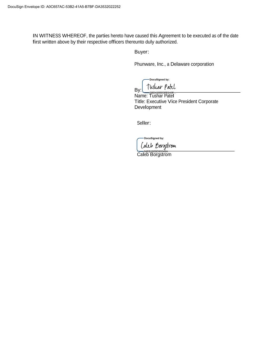 IN WITNESS WHEREOF, the parties hereto have caused this Agreement to be executed as of the date first written above by their respective officers thereunto duly authorized. Buyer: Phunware, Inc., a Delaware corporation By: _______________________________________ Name: Tushar Patel Title: Executive Vice President Corporate Development Seller: _______________________________________ Caleb Borgstrom DocuSign Envelope ID: A0C657AC-53B2-41A5-B7BF-DA3532022252