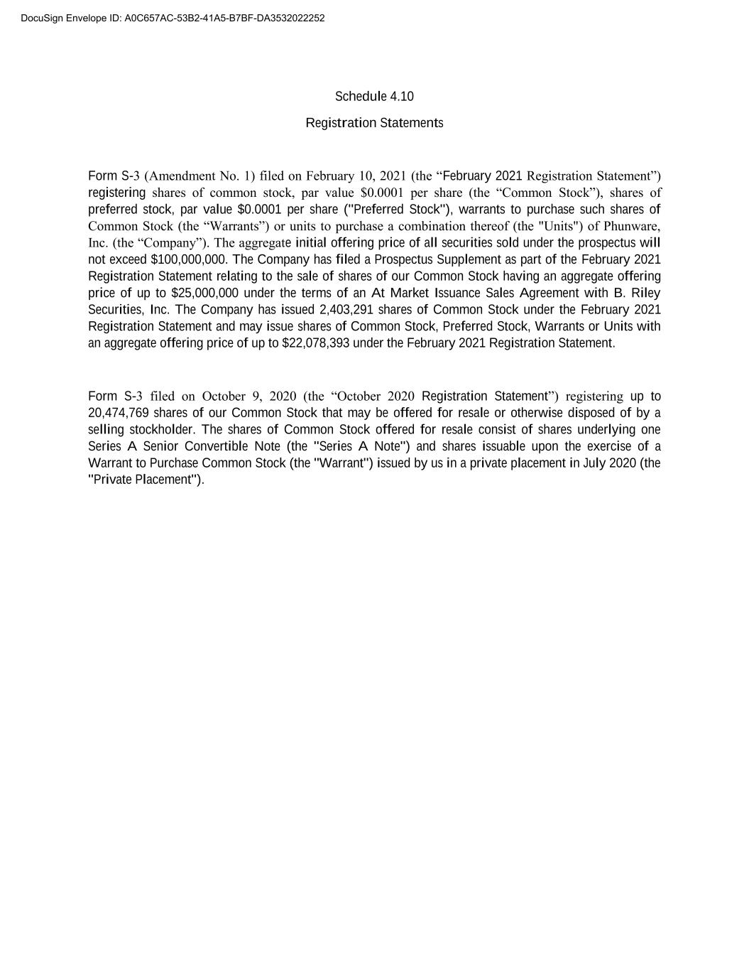 Schedule 4.10 Registration Statements Form S-3 (Amendment No. 1) filed on February 10, 2021 (the “February 2021 Registration Statement”) registering shares of common stock, par value $0.0001 per share (the “Common Stock”), shares of preferred stock, par value $0.0001 per share ("Preferred Stock"), warrants to purchase such shares of Common Stock (the “Warrants”) or units to purchase a combination thereof (the "Units") of Phunware, Inc. (the “Company”). The aggregate initial offering price of all securities sold under the prospectus will not exceed $100,000,000. The Company has filed a Prospectus Supplement as part of the February 2021 Registration Statement relating to the sale of shares of our Common Stock having an aggregate offering price of up to $25,000,000 under the terms of an At Market Issuance Sales Agreement with B. Riley Securities, Inc. The Company has issued 2,403,291 shares of Common Stock under the February 2021 Registration Statement and may issue shares of Common Stock, Preferred Stock, Warrants or Units with an aggregate offering price of up to $22,078,393 under the February 2021 Registration Statement. Form S-3 filed on October 9, 2020 (the “October 2020 Registration Statement”) registering up to 20,474,769 shares of our Common Stock that may be offered for resale or otherwise disposed of by a selling stockholder. The shares of Common Stock offered for resale consist of shares underlying one Series A Senior Convertible Note (the "Series A Note") and shares issuable upon the exercise of a Warrant to Purchase Common Stock (the "Warrant") issued by us in a private placement in July 2020 (the "Private Placement"). DocuSign Envelope ID: A0C657AC-53B2-41A5-B7BF-DA3532022252