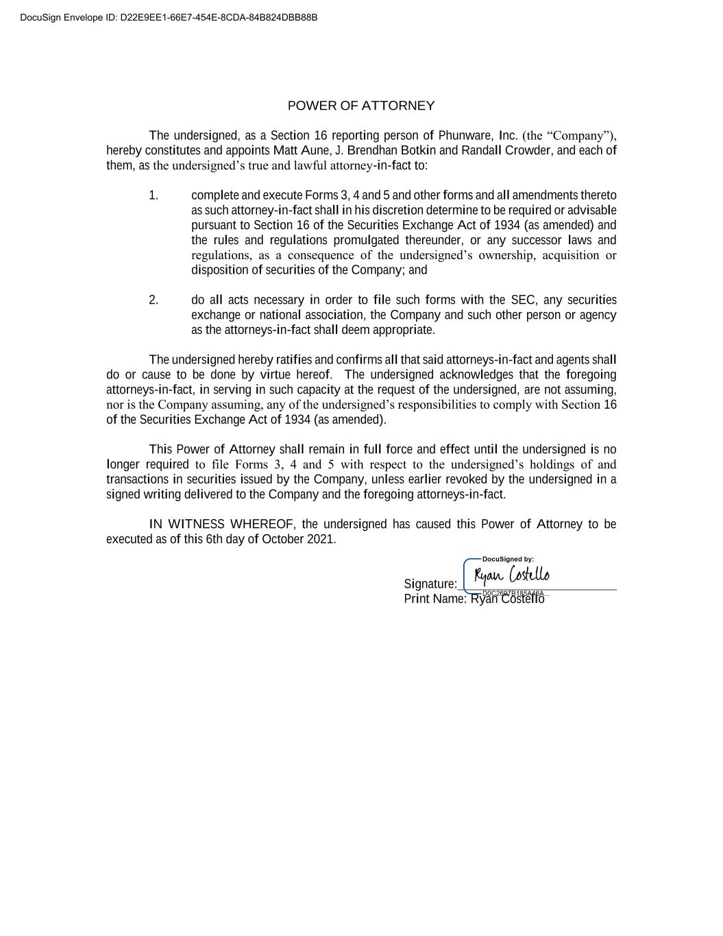 POWER OF ATTORNEY The undersigned, as a Section 16 reporting person of Phunware, Inc. (the “Company”), hereby constitutes and appoints Matt Aune, J. Brendhan Botkin and Randall Crowder, and each of them, as the undersigned’s true and lawful attorney-in-fact to: 1. complete and execute Forms 3, 4 and 5 and other forms and all amendments thereto as such attorney-in-fact shall in his discretion determine to be required or advisable pursuant to Section 16 of the Securities Exchange Act of 1934 (as amended) and the rules and regulations promulgated thereunder, or any successor laws and regulations, as a consequence of the undersigned’s ownership, acquisition or disposition of securities of the Company; and 2. do all acts necessary in order to file such forms with the SEC, any securities exchange or national association, the Company and such other person or agency as the attorneys-in-fact shall deem appropriate. The undersigned hereby ratifies and confirms all that said attorneys-in-fact and agents shall do or cause to be done by virtue hereof. The undersigned acknowledges that the foregoing attorneys-in-fact, in serving in such capacity at the request of the undersigned, are not assuming, nor is the Company assuming, any of the undersigned’s responsibilities to comply with Section 16 of the Securities Exchange Act of 1934 (as amended). This Power of Attorney shall remain in full force and effect until the undersigned is no longer required to file Forms 3, 4 and 5 with respect to the undersigned’s holdings of and transactions in securities issued by the Company, unless earlier revoked by the undersigned in a signed writing delivered to the Company and the foregoing attorneys-in-fact. IN WITNESS WHEREOF, the undersigned has caused this Power of Attorney to be executed as of this 6th day of October 2021. Signature: Print Name: Ryan Costello DocuSign Envelope ID: D22E9EE1-66E7-454E-8CDA-84B824DBB88B